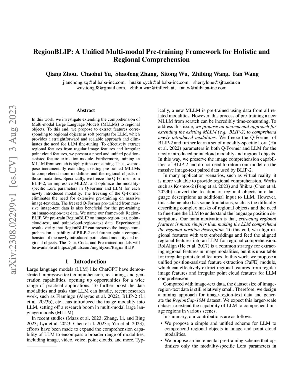 In this work, we investigate extending the comprehension of Multi-modal Large Language Models (MLLMs) to regional objects. To this end, we propose to extract features corresponding to regional objects as soft prompts for LLM, which provides a straightforward and scalable approach and eliminates the need for LLM fine-tuning. To effectively extract regional features from regular image features and irregular point cloud features, we present a novel and unified position-assisted feature extraction module. Furthermore, training an MLLM from scratch is highly time-consuming. Thus, we propose incrementally extending existing pre-trained MLLMs to comprehend more modalities and the regional objects of those modalities. Specifically, we freeze the Q-Former from BLIP-2, an impressive MLLM, and optimize the modality-specific Lora parameters in Q-Former and LLM for each newly introduced modality. The freezing of the Q-Former eliminates the need for extensive pre-training on massive image-text data. The freezed Q-Former pre-trained from massive image-text data is also beneficial for the pre-training on image-region-text data. We name our framework RegionBLIP. We pre-train RegionBLIP on image-region-text, point-cloud-text, and point-cloud-region-text data. Experimental results verify that \Ours{} can preserve the image comprehension capability of BILP-2 and further gain a comprehension of the newly introduced point cloud modality and regional objects. The Data, Code, and Pre-trained models will be available at https://github.com/mightyzau/RegionBLIP.