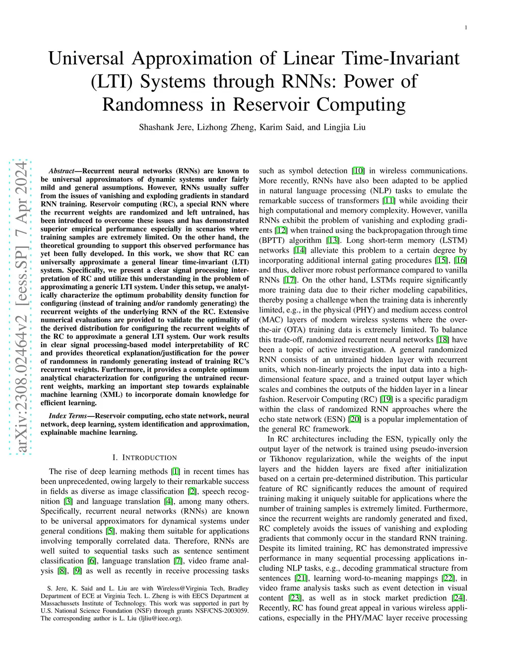 Recurrent neural networks (RNNs) are known to be universal approximators of dynamic systems under fairly mild and general assumptions. However, RNNs usually suffer from the issues of vanishing and exploding gradients in standard RNN training. Reservoir computing (RC), a special RNN where the recurrent weights are randomized and left untrained, has been introduced to overcome these issues and has demonstrated superior empirical performance especially in scenarios where training samples are extremely limited. On the other hand, the theoretical grounding to support this observed performance has yet been fully developed. In this work, we show that RC can universally approximate a general linear time-invariant (LTI) system. Specifically, we present a clear signal processing interpretation of RC and utilize this understanding in the problem of approximating a generic LTI system. Under this setup, we analytically characterize the optimum probability density function for configuring (instead of training and/or randomly generating) the recurrent weights of the underlying RNN of the RC. Extensive numerical evaluations are provided to validate the optimality of the derived distribution for configuring the recurrent weights of the RC to approximate a general LTI system. Our work results in clear signal processing-based model interpretability of RC and provides theoretical explanation/justification for the power of randomness in randomly generating instead of training RC's recurrent weights. Furthermore, it provides a complete optimum analytical characterization for configuring the untrained recurrent weights, marking an important step towards explainable machine learning (XML) to incorporate domain knowledge for efficient learning.