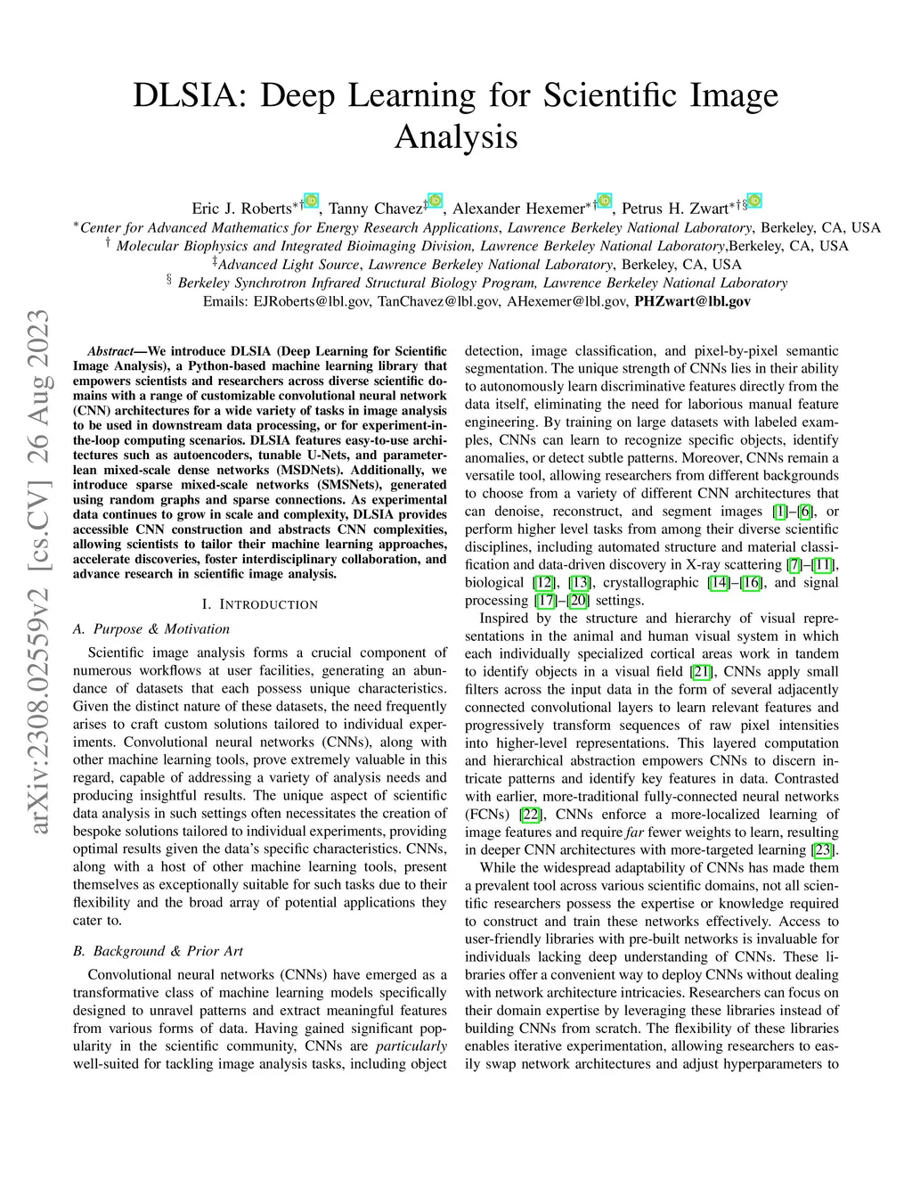 We introduce DLSIA (Deep Learning for Scientific Image Analysis), a Python-based machine learning library that empowers scientists and researchers across diverse scientific domains with a range of customizable convolutional neural network (CNN) architectures for a wide variety of tasks in image analysis to be used in downstream data processing, or for experiment-in-the-loop computing scenarios. DLSIA features easy-to-use architectures such as autoencoders, tunable U-Nets, and parameter-lean mixed-scale dense networks (MSDNets). Additionally, we introduce sparse mixed-scale networks (SMSNets), generated using random graphs and sparse connections. As experimental data continues to grow in scale and complexity, DLSIA provides accessible CNN construction and abstracts CNN complexities, allowing scientists to tailor their machine learning approaches, accelerate discoveries, foster interdisciplinary collaboration, and advance research in scientific image analysis.