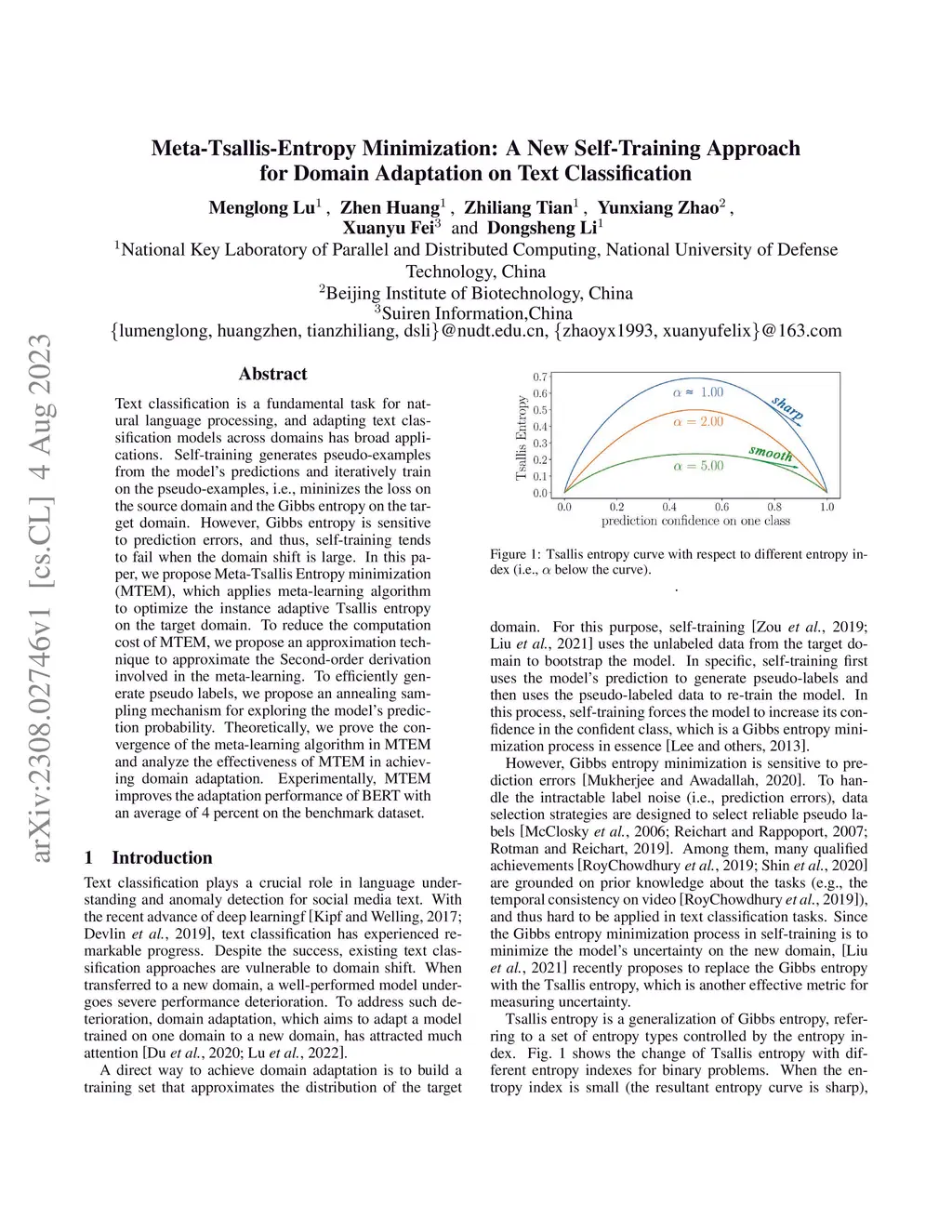 Text classification is a fundamental task for natural language processing, and adapting text classification models across domains has broad applications. Self-training generates pseudo-examples from the model's predictions and iteratively trains on the pseudo-examples, i.e., minimizes the loss on the source domain and the Gibbs entropy on the target domain. However, Gibbs entropy is sensitive to prediction errors, and thus, self-training tends to fail when the domain shift is large. In this paper, we propose Meta-Tsallis Entropy minimization (MTEM), which applies a meta-learning algorithm to optimize the instance adaptive Tsallis entropy on the target domain. To reduce the computation cost of MTEM, we propose an approximation technique to approximate the Second-order derivation involved in the meta-learning. To efficiently generate pseudo labels, we propose an annealing sampling mechanism for exploring the model's prediction probability. Theoretically, we prove the convergence of the meta-learning algorithm in MTEM and analyze the effectiveness of MTEM in achieving domain adaptation. Experimentally, MTEM improves the adaptation performance of BERT with an average of 4 percent on the benchmark dataset.