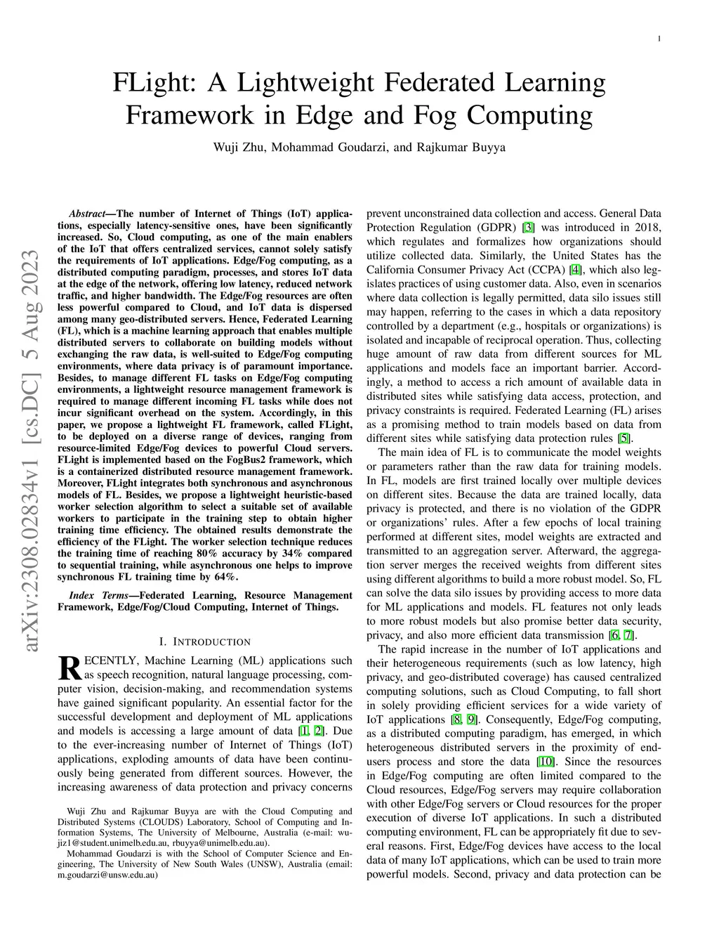 The number of Internet of Things (IoT) applications, especially latency-sensitive ones, have been significantly increased. So, Cloud computing, as one of the main enablers of the IoT that offers centralized services, cannot solely satisfy the requirements of IoT applications. Edge/Fog computing, as a distributed computing paradigm, processes, and stores IoT data at the edge of the network, offering low latency, reduced network traffic, and higher bandwidth. The Edge/Fog resources are often less powerful compared to Cloud, and IoT data is dispersed among many geo-distributed servers. Hence, Federated Learning (FL), which is a machine learning approach that enables multiple distributed servers to collaborate on building models without exchanging the raw data, is well-suited to Edge/Fog computing environments, where data privacy is of paramount importance. Besides, to manage different FL tasks on Edge/Fog computing environments, a lightweight resource management framework is required to manage different incoming FL tasks while does not incur significant overhead on the system. Accordingly, in this paper, we propose a lightweight FL framework, called FLight, to be deployed on a diverse range of devices, ranging from resource limited Edge/Fog devices to powerful Cloud servers. FLight is implemented based on the FogBus2 framework, which is a containerized distributed resource management framework. Moreover, FLight integrates both synchronous and asynchronous models of FL. Besides, we propose a lightweight heuristic-based worker selection algorithm to select a suitable set of available workers to participate in the training step to obtain higher training time efficiency. The obtained results demonstrate the efficiency of the FLight.