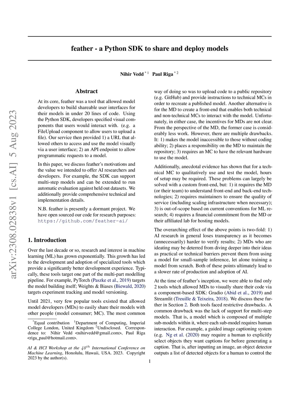 At its core, feather was a tool that allowed model developers to build shareable user interfaces for their models in under 20 lines of code. Using the Python SDK, developers specified visual components that users would interact with. (e.g. a FileUpload component to allow users to upload a file). Our service then provided 1) a URL that allowed others to access and use the model visually via a user interface; 2) an API endpoint to allow programmatic requests to a model. In this paper, we discuss feather's motivations and the value we intended to offer AI researchers and developers. For example, the SDK can support multi-step models and can be extended to run automatic evaluation against held out datasets. We additionally provide comprehensive technical and implementation details. N.B. feather is presently a dormant project. We have open sourced our code for research purposes: https://github.com/feather-ai/