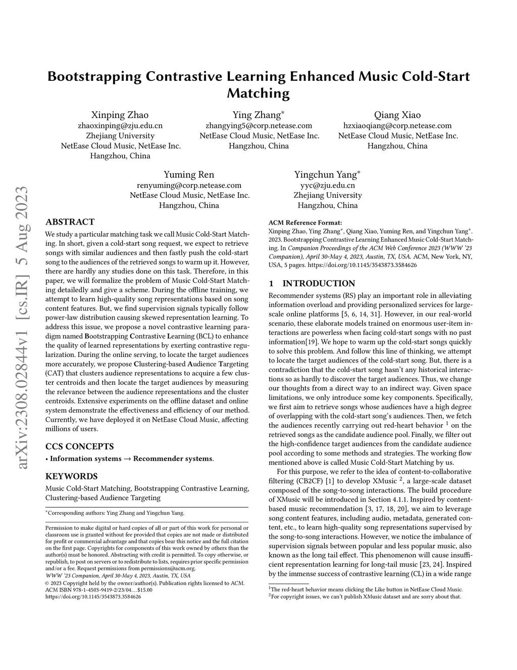 Bootstrapping Contrastive Learning Enhanced Music Cold-Start Matching