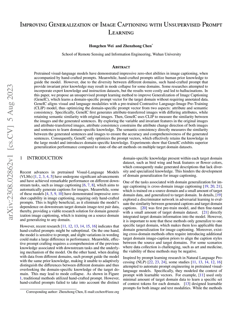 Pretrained visual-language models have demonstrated impressive zero-shot abilities in image captioning, when accompanied by hand-crafted prompts. Meanwhile, hand-crafted prompts utilize human prior knowledge to guide the model. However, due to the diversity between different domains, such hand-crafted prompt that provide invariant prior knowledge may result in mode collapse for some domains. Some researches attempted to incorporate expert knowledge and instruction datasets, but the results were costly and led to hallucinations. In this paper, we propose an unsupervised prompt learning method to improve Generalization of Image Captioning (GeneIC), which learns a domain-specific prompt vector for the target domain without requiring annotated data. GeneIC aligns visual and language modalities with a pre-trained Contrastive Language-Image Pre-Training (CLIP) model, thus optimizing the domain-specific prompt vector from two aspects: attribute and semantic consistency. Specifically, GeneIC first generates attribute-transferred images with differing attributes, while retaining semantic similarity with original images. Then, GeneIC uses CLIP to measure the similarity between the images and the generated sentences. By exploring the variable and invariant features in the original images and attribute-transferred images, attribute consistency constrains the attribute change direction of both images and sentences to learn domain-specific knowledge. The semantic consistency directly measures the similarity between the generated sentences and images to ensure the accuracy and comprehensiveness of the generated sentences. Consequently, GeneIC only optimizes the prompt vectors, which effectively retains the knowledge in the large model and introduces domain-specific knowledge.