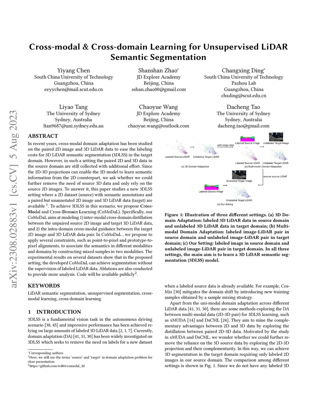 In recent years, cross-modal domain adaptation has been studied on the paired 2D image and 3D LiDAR data to ease the labeling costs for 3D LiDAR semantic segmentation (3DLSS) in the target domain. However, in such a setting the paired 2D and 3D data in the source domain are still collected with additional effort. Since the 2D-3D projections can enable the 3D model to learn semantic information from the 2D counterpart, we ask whether we could further remove the need of source 3D data and only rely on the source 2D images. To answer it, this paper studies a new 3DLSS setting where a 2D dataset (source) with semantic annotations and a paired but unannotated 2D image and 3D LiDAR data (target) are available. To achieve 3DLSS in this scenario, we propose Cross-Modal and Cross-Domain Learning (CoMoDaL). Specifically, our CoMoDaL aims at modeling 1) inter-modal cross-domain distillation between the unpaired source 2D image and target 3D LiDAR data, and 2) the intra-domain cross-modal guidance between the target 2D image and 3D LiDAR data pair. In CoMoDaL, we propose to apply several constraints, such as point-to-pixel and prototype-to-pixel alignments, to associate the semantics in different modalities and domains by constructing mixed samples in two modalities. The experimental results on several datasets show that in the proposed setting, the developed CoMoDaL can achieve segmentation without the supervision of labeled LiDAR data. Ablations are also conducted to provide more analysis. Code will be available publicly.