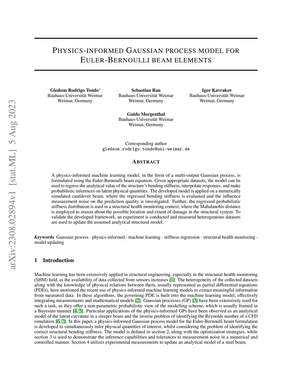 A physics-informed machine learning model, in the form of a multi-output Gaussian process, is formulated using the Euler-Bernoulli beam equation. Given appropriate datasets, the model can be used to regress the analytical value of the structure's bending stiffness, interpolate responses, and make probabilistic inferences on latent physical quantities. The developed model is applied on a numerically simulated cantilever beam, where the regressed bending stiffness is evaluated and the influence measurement noise on the prediction quality is investigated. Further, the regressed probabilistic stiffness distribution is used in a structural health monitoring context, where the Mahalanobis distance is employed to reason about the possible location and extent of damage in the structural system. To validate the developed framework, an experiment is conducted and measured heterogeneous datasets are used to update the assumed analytical structural model.