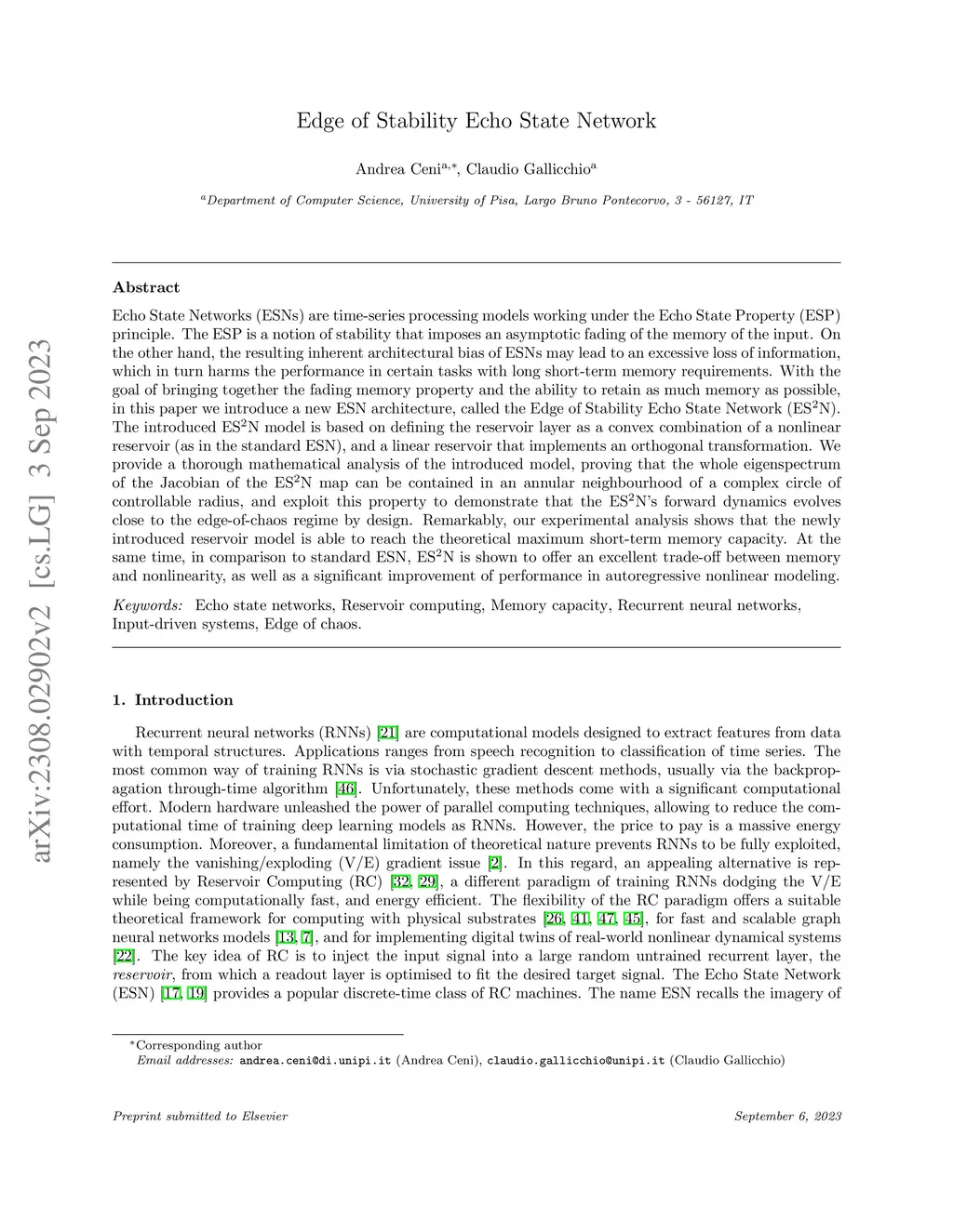 In this paper, we propose a new Reservoir Computing (RC) architecture, called the Edge of Stability Echo State Network (ESN). The introduced ESN model is based on defining the reservoir layer as a convex combination of a nonlinear reservoir (as in the standard ESN), and a linear reservoir that implements an orthogonal transformation. We provide a thorough mathematical analysis of the introduced model, proving that the whole eigenspectrum of the Jacobian of the ES2N map can be contained in an annular neighbourhood of a complex circle of controllable radius, and exploit this property to demonstrate that the ESN's forward dynamics evolves close to the edge-of-chaos regime by design. Remarkably, our experimental analysis shows that the newly introduced reservoir model is able to reach the theoretical maximum short-term memory capacity. At the same time, in comparison to standard ESN, ESN is shown to offer a favorable trade-off between memory and nonlinearity, as well as a significant improvement of performance in autoregressive nonlinear modeling.