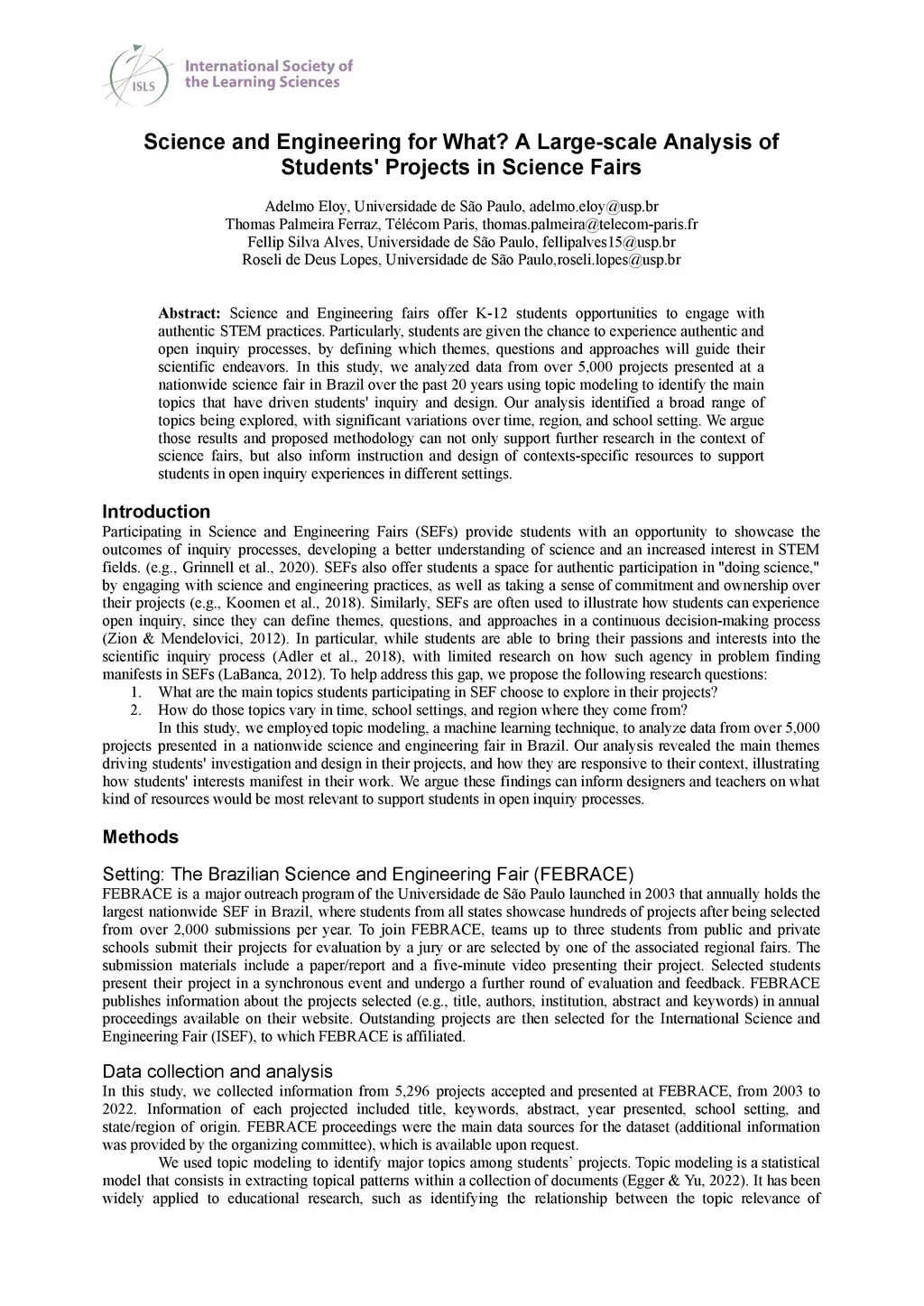 Science and Engineering fairs offer K-12 students opportunities to engage with authentic STEM practices. Particularly, students are given the chance to experience authentic and open inquiry processes, by defining which themes, questions and approaches will guide their scientific endeavors. In this study, we analyzed data from over 5,000 projects presented at a nationwide science fair in Brazil over the past 20 years using topic modeling to identify the main topics that have driven students' inquiry and design. Our analysis identified a broad range of topics being explored, with significant variations over time, region, and school setting. We argue those results and proposed methodology can not only support further research in the context of science fairs, but also inform instruction and design of contexts-specific resources to support students in open inquiry experiences in different settings.
