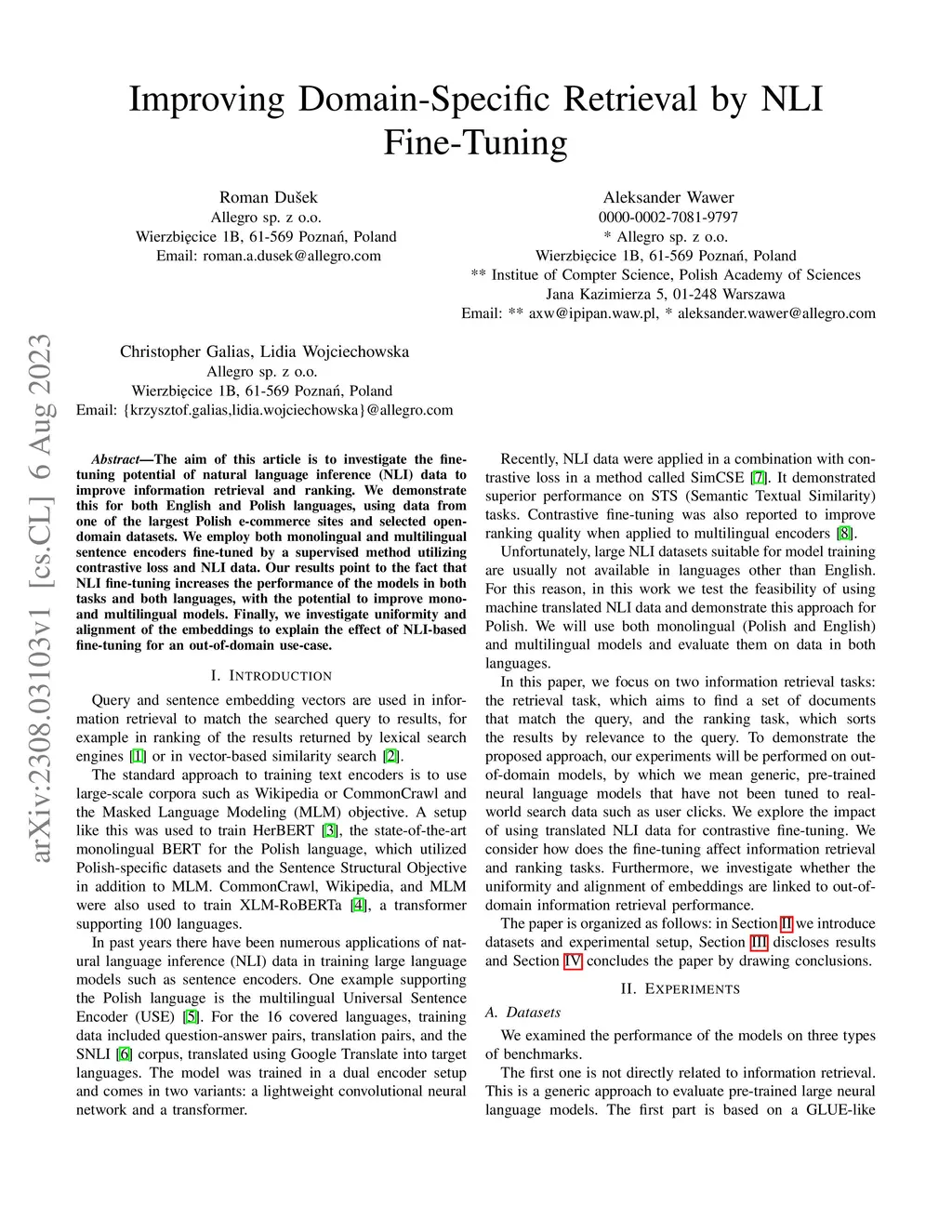 The aim of this article is to investigate the fine-tuning potential of natural language inference (NLI) data to improve information retrieval and ranking. We demonstrate this for both English and Polish languages, using data from one of the largest Polish e-commerce sites and selected open-domain datasets. We employ both monolingual and multilingual sentence encoders fine-tuned by a supervised method utilizing contrastive loss and NLI data. Our results point to the fact that NLI fine-tuning increases the performance of the models in both tasks and both languages, with the potential to improve mono- and multilingual models. Finally, we investigate uniformity and alignment of the embeddings to explain the effect of NLI-based fine-tuning for an out-of-domain use-case.