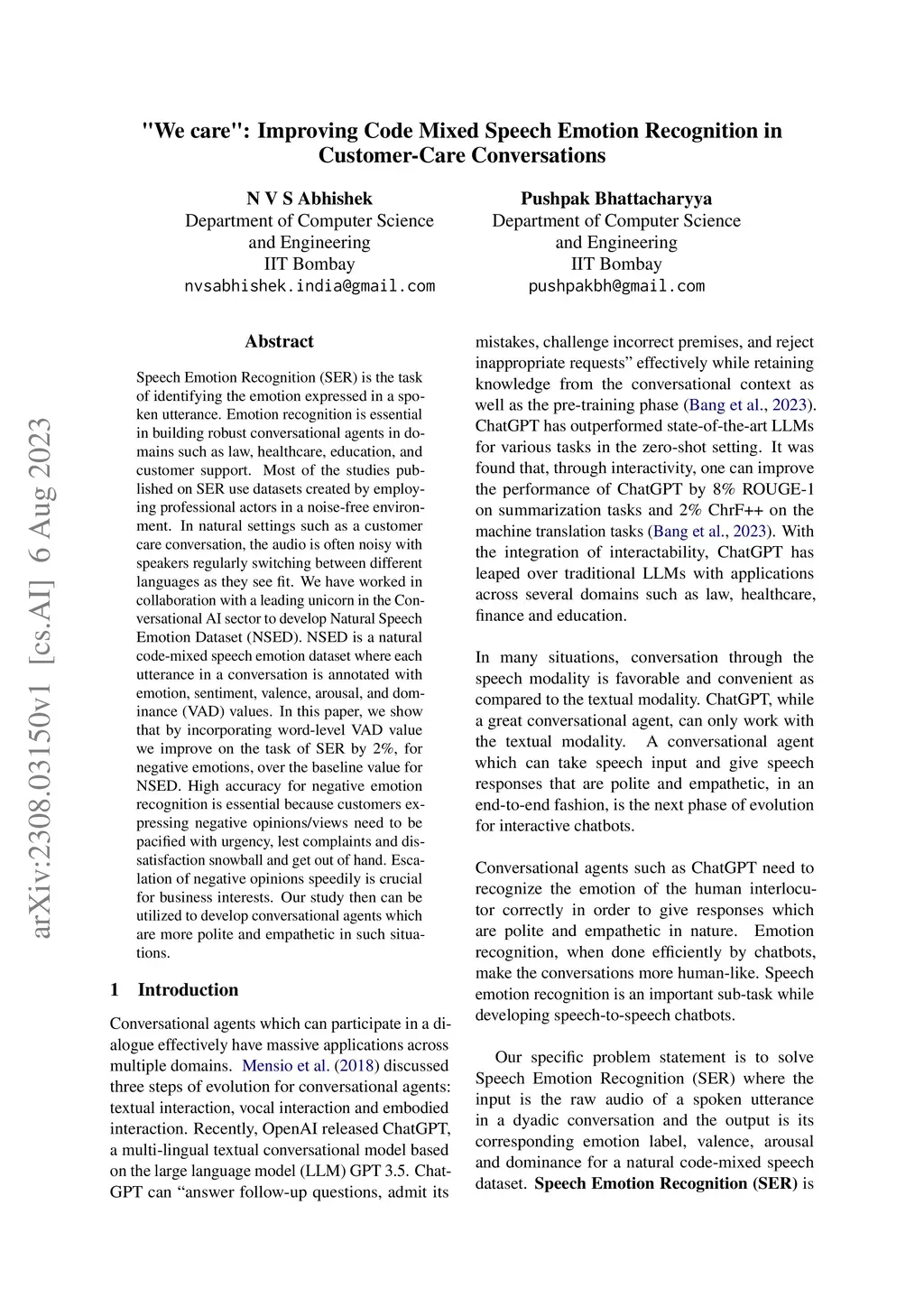 "We care": Improving Code Mixed Speech Emotion Recognition in