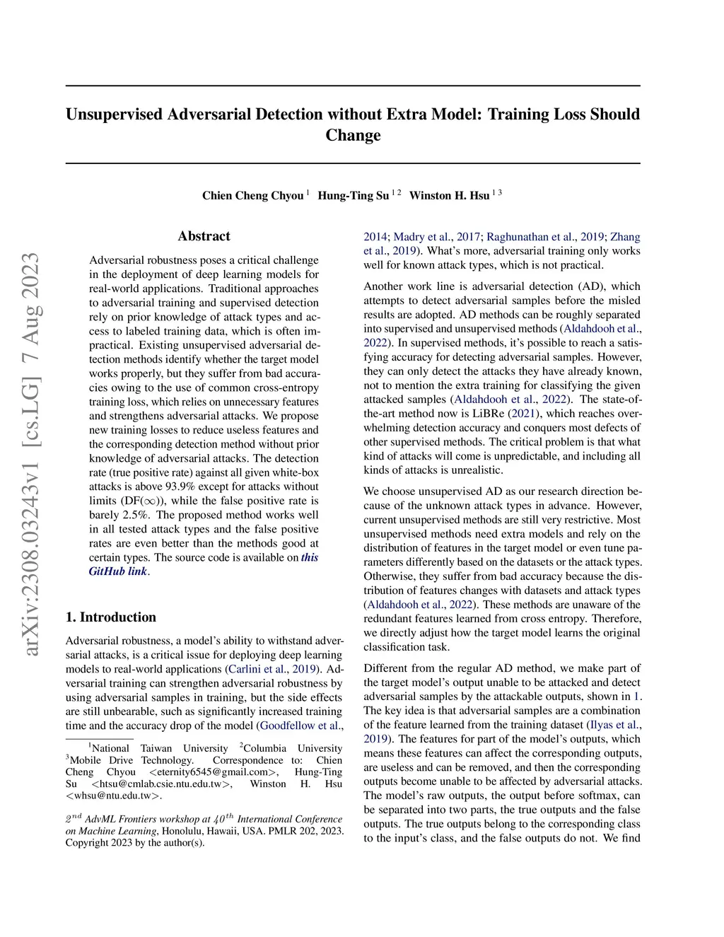 Adversarial robustness poses a critical challenge in the deployment of deep learning models for real-world applications. Traditional approaches to adversarial training and supervised detection rely on prior knowledge of attack types and access to labeled training data, which is often impractical. Existing unsupervised adversarial detection methods identify whether the target model works properly, but they suffer from bad accuracies owing to the use of common cross-entropy training loss, which relies on unnecessary features and strengthens adversarial attacks. We propose new training losses to reduce useless features and the corresponding detection method without prior knowledge of adversarial attacks. The detection rate (true positive rate) against all given white-box attacks is above 93.9% except for attacks without limits (DF()), while the false positive rate is barely 2.5%. The proposed method works well in all tested attack types and the false positive rates are even better than the methods good at certain types.