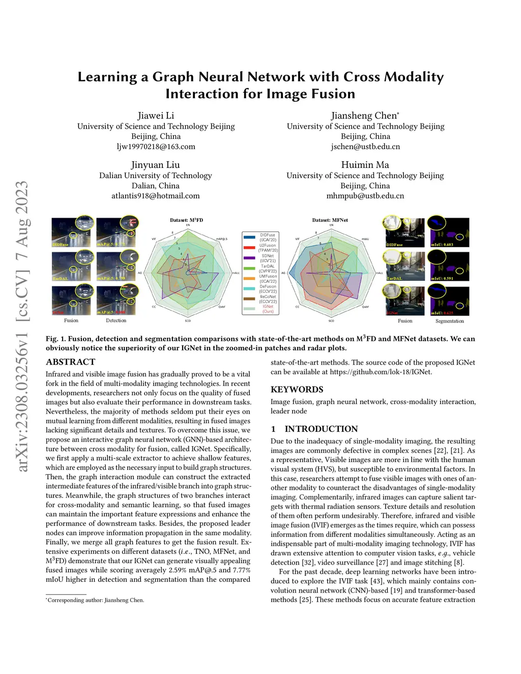 Infrared and visible image fusion has gradually proved to be a vital fork in the field of multi-modality imaging technologies. In recent developments, researchers not only focus on the quality of fused images but also evaluate their performance in downstream tasks. Nevertheless, the majority of methods seldom put their eyes on the mutual learning from different modalities, resulting in fused images lacking significant details and textures. To overcome this issue, we propose an interactive graph neural network (GNN)-based architecture between cross modality for fusion, called IGNet. Specifically, we first apply a multi-scale extractor to achieve shallow features, which are employed as the necessary input to build graph structures. Then, the graph interaction module can construct the extracted intermediate features of the infrared/visible branch into graph structures. Meanwhile, the graph structures of two branches interact for cross-modality and semantic learning, so that fused images can maintain the important feature expressions and enhance the performance of downstream tasks. Besides, the proposed leader nodes can improve information propagation in the same modality. Finally, we merge all graph features to get the fusion result. Extensive experiments on different datasets (TNO, MFNet and M3FD) demonstrate that our IGNet can generate visually appealing fused images while scoring averagely 2.59% mAP@.5 and 7.77% mIoU higher in detection and segmentation than the compared state-of-the-art methods. The source code of the proposed IGNet can be available at https://github.com/lok-18/IGNet.