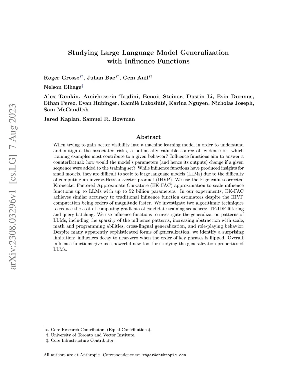 When trying to gain better visibility into a machine learning model in order to understand and mitigate the associated risks, a potentially valuable source of evidence is: which training examples most contribute to a given behavior? Influence functions aim to answer a counterfactual: how would the model's parameters (and hence its outputs) change if a given sequence were added to the training set? While influence functions have produced insights for small models, they are difficult to scale to large language models (LLMs) due to the difficulty of computing an inverse-Hessian-vector product (IHVP). We use the Eigenvalue-corrected Kronecker-Factored Approximate Curvature (EK-FAC) approximation to scale influence functions up to LLMs with up to 52 billion parameters. In our experiments, EK-FAC achieves similar accuracy to traditional influence function estimators despite the IHVP computation being orders of magnitude faster. We investigate two algorithmic techniques to reduce the cost of computing gradients of candidate training sequences: TF-IDF filtering and query batching. We use influence functions to investigate the generalization patterns of LLMs, including the sparsity of the influence patterns, increasing abstraction with scale, math and programming abilities, cross-lingual generalization, and role-playing behavior. Despite many apparently sophisticated forms of generalization, we identify a surprising limitation: influences decay to near-zero when the order of key phrases is flipped. Overall, influence functions give us a powerful new tool for studying the generalization properties of LLMs.