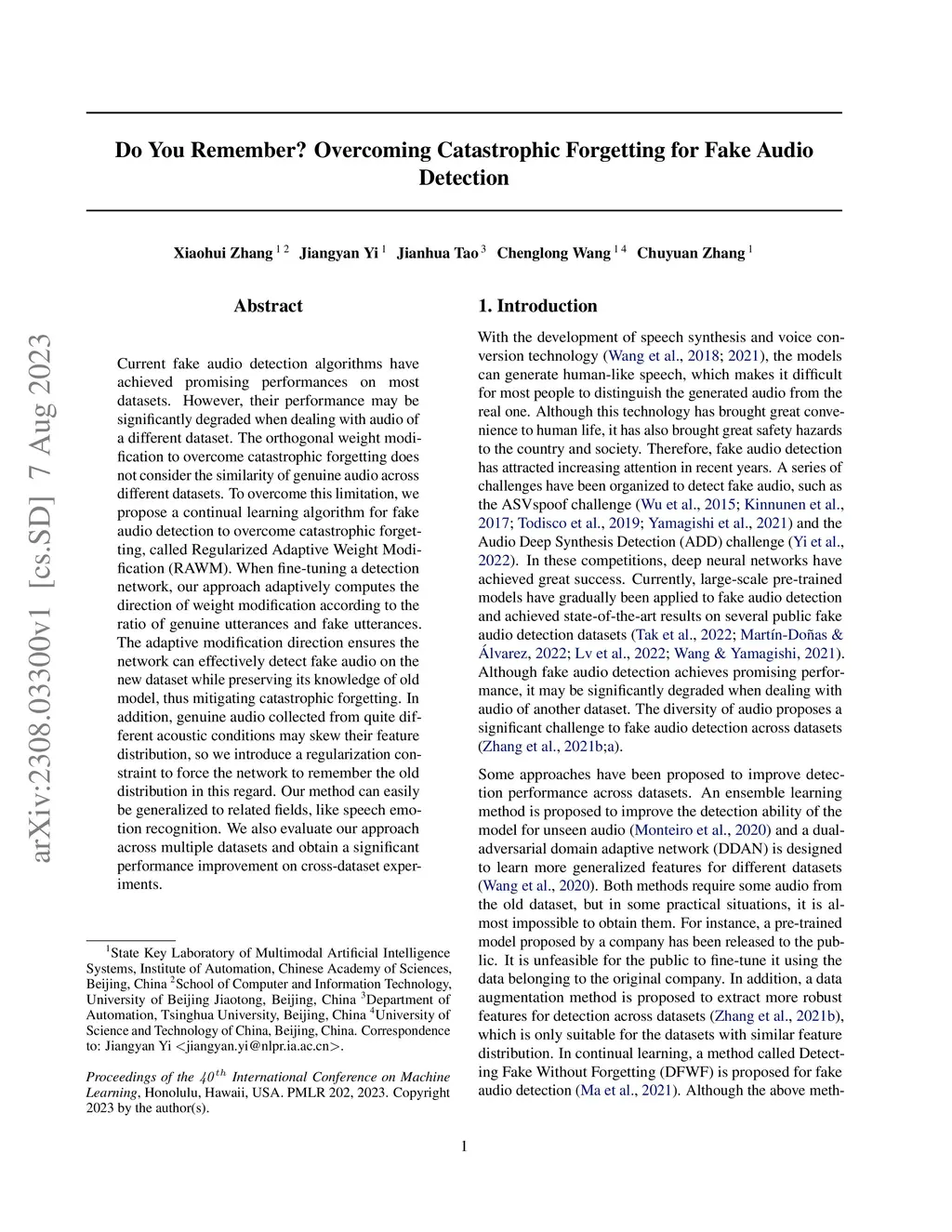 Current fake audio detection algorithms have achieved promising performances on most datasets. However, their performance may be significantly degraded when dealing with audio of a different dataset. The orthogonal weight modification to overcome catastrophic forgetting does not consider the similarity of genuine audio across different datasets. To overcome this limitation, we propose a continual learning algorithm for fake audio detection to overcome catastrophic forgetting, called Regularized Adaptive Weight Modification (RAWM). When fine-tuning a detection network, our approach adaptively computes the direction of weight modification according to the ratio of genuine utterances and fake utterances. The adaptive modification direction ensures the network can effectively detect fake audio on the new dataset while preserving its knowledge of old model, thus mitigating catastrophic forgetting. In addition, genuine audio collected from quite different acoustic conditions may skew their feature distribution, so we introduce a regularization constraint to force the network to remember the old distribution in this regard. Our method can easily be generalized to related fields, like speech emotion recognition. We also evaluate our approach across multiple datasets and obtain a significant performance improvement on cross-dataset experiments.