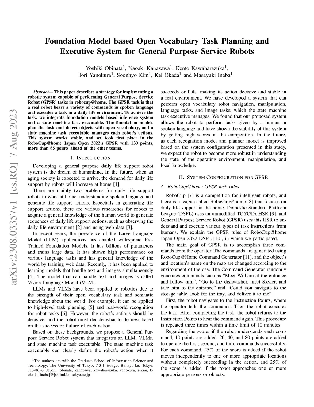 This paper describes a strategy for implementing a robotic system capable of performing General Purpose Service Robot (GPSR) tasks in robocup@home. The GPSR task is that a real robot hears a variety of commands in spoken language and executes a task in a daily life environment. To achieve the task, we integrate foundation models based inference system and a state machine task executable. The foundation models plan the task and detect objects with open vocabulary, and a state machine task executable manages each robot's actions. This system works stable, and we took first place in the RoboCup@home Japan Open 2022's GPSR with 130 points, more than 85 points ahead of the other teams.