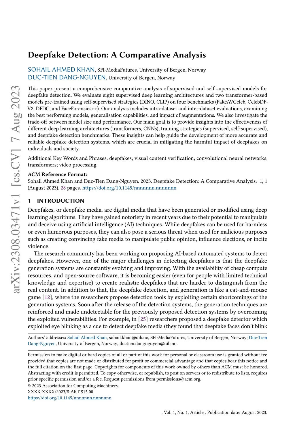 This paper present a comprehensive comparative analysis of supervised and self-supervised models for deepfake detection. We evaluate eight supervised deep learning architectures and two transformer-based models pre-trained using self-supervised strategies (DINO, CLIP) on four benchmarks (FakeAVCeleb, CelebDF-V2, DFDC, and FaceForensics++). Our analysis includes intra-dataset and inter-dataset evaluations, examining the best performing models, generalisation capabilities, and impact of augmentations. We also investigate the trade-off between model size and performance. Our main goal is to provide insights into the effectiveness of different deep learning architectures (transformers, CNNs), training strategies (supervised, self-supervised), and deepfake detection benchmarks. These insights can help guide the development of more accurate and reliable deepfake detection systems, which are crucial in mitigating the harmful impact of deepfakes on individuals and society.