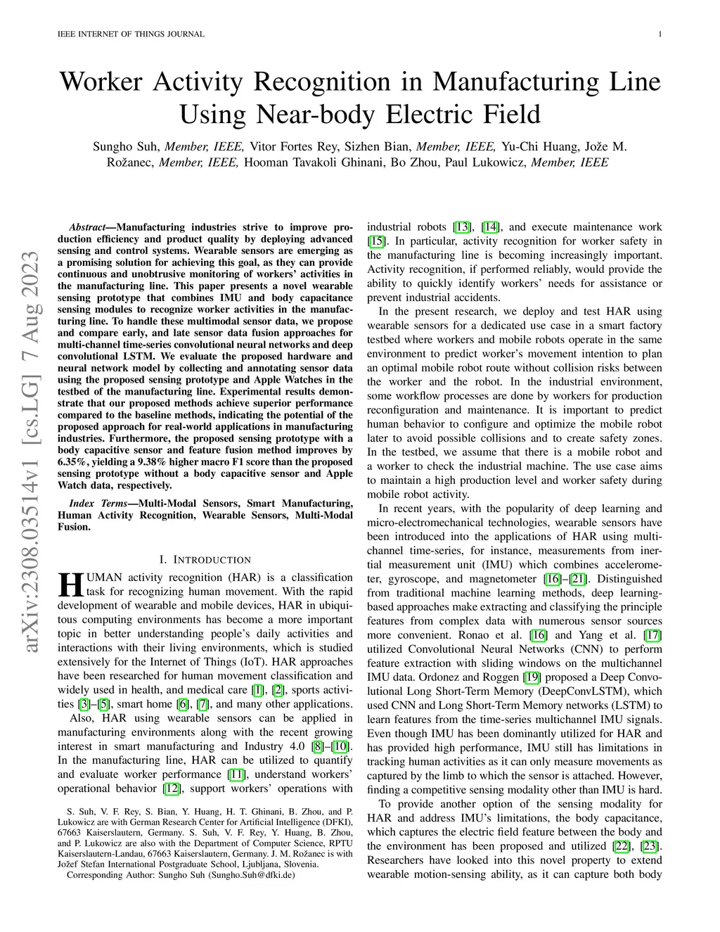 Manufacturing industries strive to improve production efficiency and product quality by deploying advanced sensing and control systems. Wearable sensors are emerging as a promising solution for achieving this goal, as they can provide continuous and unobtrusive monitoring of workers' activities in the manufacturing line. This paper presents a novel wearable sensing prototype that combines IMU and body capacitance sensing modules to recognize worker activities in the manufacturing line. To handle these multimodal sensor data, we propose and compare early, and late sensor data fusion approaches for multi-channel time-series convolutional neural networks and deep convolutional LSTM. We evaluate the proposed hardware and neural network model by collecting and annotating sensor data using the proposed sensing prototype and Apple Watches in the testbed of the manufacturing line. Experimental results demonstrate that our proposed methods achieve superior performance compared to the baseline methods, indicating the potential of the proposed approach for real-world applications in manufacturing industries. Furthermore, the proposed sensing prototype with a body capacitive sensor and feature fusion method improves by 6.35%, yielding a 9.38% higher macro F1 score than the proposed sensing prototype without a body capacitive sensor and Apple Watch data, respectively.
