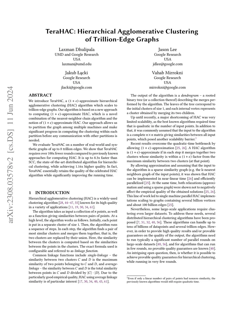 We introduce TeraHAC, a -approximate hierarchical agglomerative clustering (HAC) algorithm which scales to trillion-edge graphs. Our algorithm is based on a new approach to computing -approximate HAC, which is a novel combination of the nearest-neighbor chain algorithm and the notion of -approximate HAC. Our approach allows us to partition the graph among multiple machines and make significant progress in computing the clustering within each partition before any communication with other partitions is needed. We evaluate TeraHAC on a number of real-world and synthetic graphs of up to 8 trillion edges. We show that TeraHAC requires over 100x fewer rounds compared to previously known approaches for computing HAC. It is up to 8.3x faster than SCC, the state-of-the-art distributed algorithm for hierarchical clustering, while achieving 1.16x higher quality. In fact, TeraHAC essentially retains the quality of the celebrated HAC algorithm while significantly improving the running time.