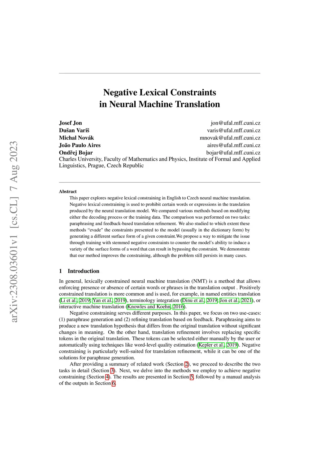 This paper explores negative lexical constraining in English to Czech neural machine translation. Negative lexical constraining is used to prohibit certain words or expressions in the translation produced by the neural translation model. We compared various methods based on modifying either the decoding process or the training data. The comparison was performed on two tasks: paraphrasing and feedback-based translation refinement. We also studied to which extent these methods "evade" the constraints presented to the model (usually in the dictionary form) by generating a different surface form of a given constraint.We propose a way to mitigate the issue through training with stemmed negative constraints to counter the model's ability to induce a variety of the surface forms of a word that can result in bypassing the constraint. We demonstrate that our method improves the constraining, although the problem still persists in many cases.