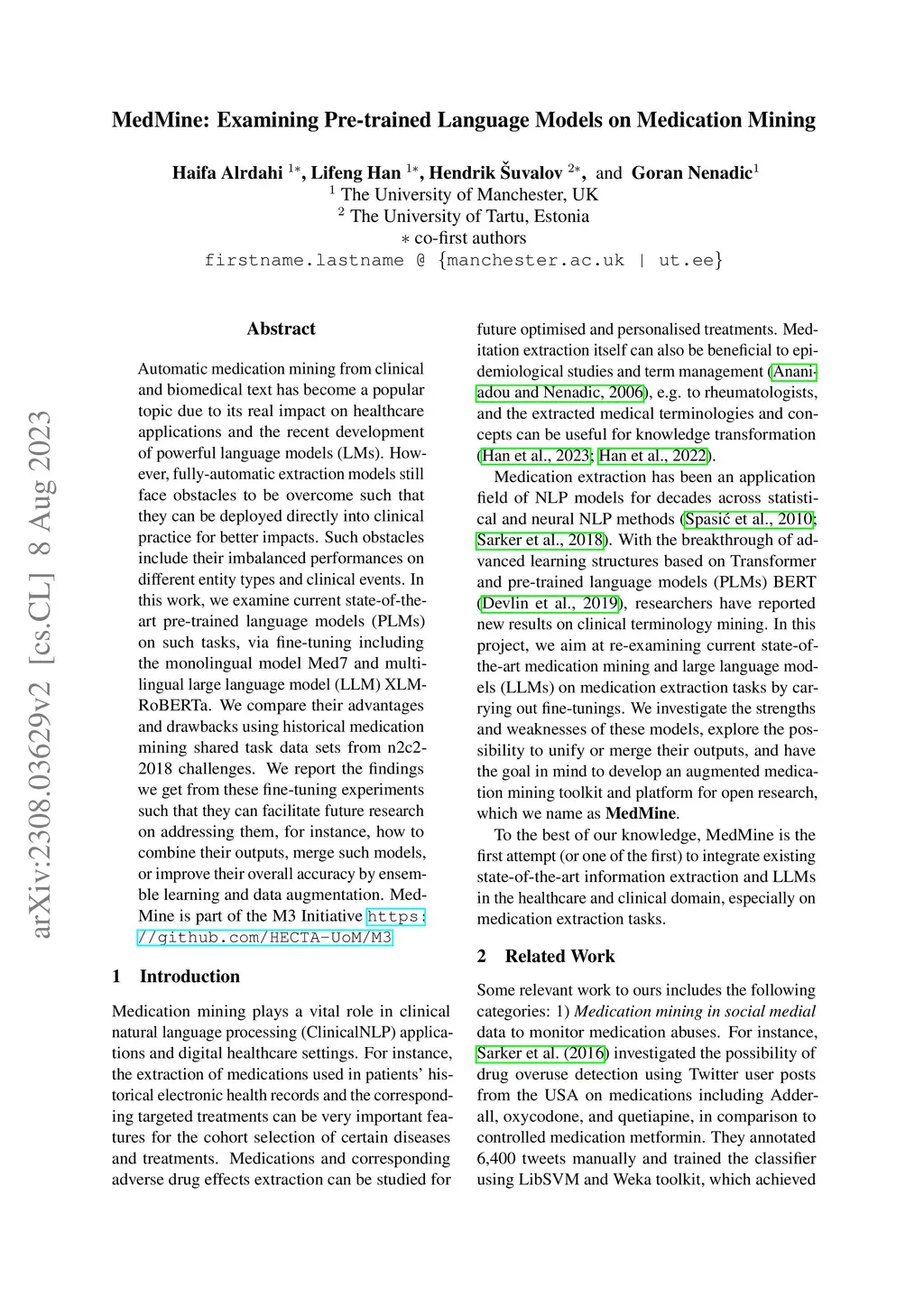 Automatic medication mining from clinical and biomedical text has become a popular topic due to its real impact on healthcare applications and the recent development of powerful language models (LMs). However, fully-automatic extraction models still face obstacles to be overcome such that they can be deployed directly into clinical practice for better impacts. Such obstacles include their imbalanced performances on different entity types and clinical events. In this work, we examine current state-of-the-art pre-trained language models (PLMs) on such tasks, via fine-tuning including the monolingual model Med7 and multilingual large language model (LLM) XLM-RoBERTa. We compare their advantages and drawbacks using historical medication mining shared task data sets from n2c2-2018 challenges. We report the findings we get from these fine-tuning experiments such that they can facilitate future research on addressing them, for instance, how to combine their outputs, merge such models, or improve their overall accuracy by ensemble learning and data augmentation. MedMine is part of the M3 Initiative \url{https://github.com/HECTA-UoM/M3}