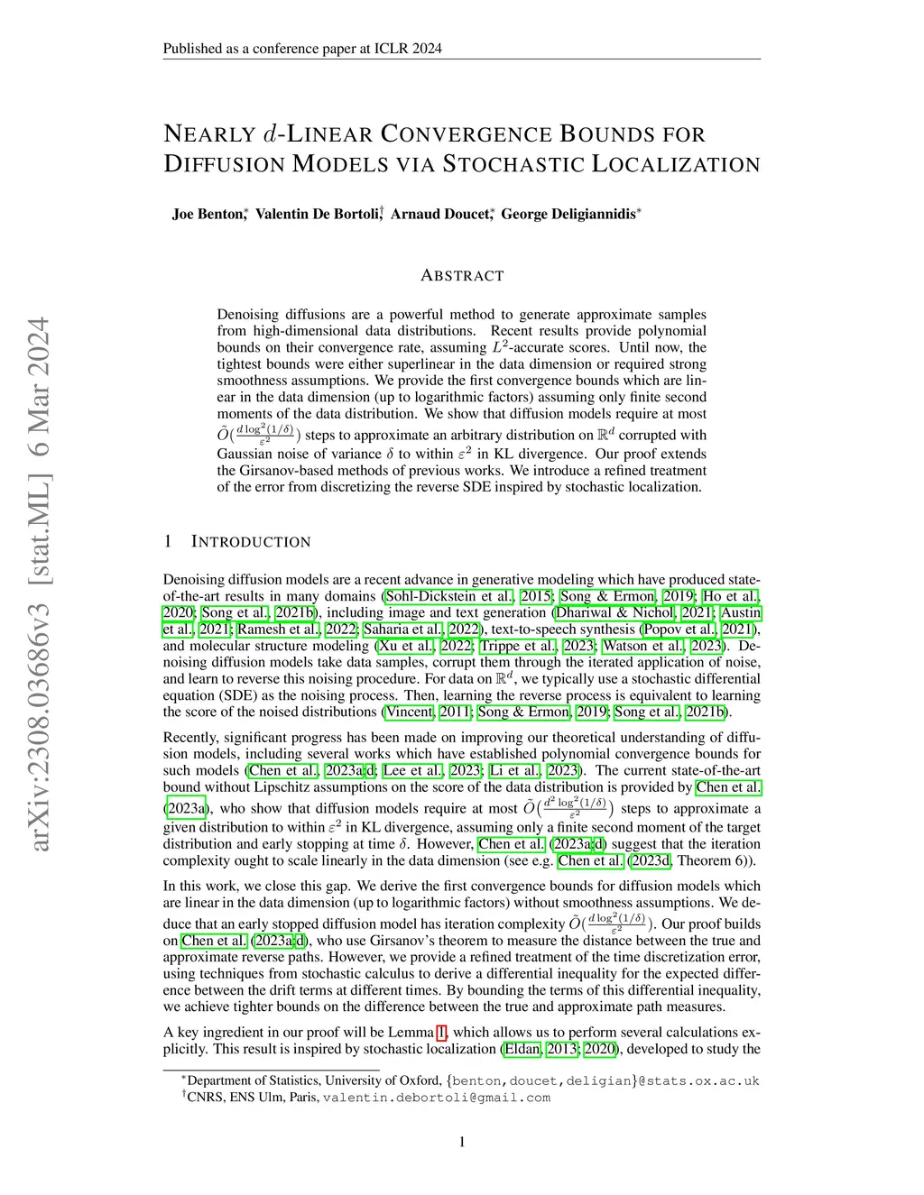Denoising diffusions are a powerful method to generate approximate samples from high-dimensional data distributions. Recent results provide polynomial bounds on their convergence rate, assuming -accurate scores. Until now, the tightest bounds were either superlinear in the data dimension or required strong smoothness assumptions. We provide the first convergence bounds which are linear in the data dimension (up to logarithmic factors) assuming only finite second moments of the data distribution. We show that diffusion models require at most steps to approximate an arbitrary distribution on corrupted with Gaussian noise of variance to within in KL divergence. Our proof extends the Girsanov-based methods of previous works. We introduce a refined treatment of the error from discretizing the reverse SDE inspired by stochastic localization.