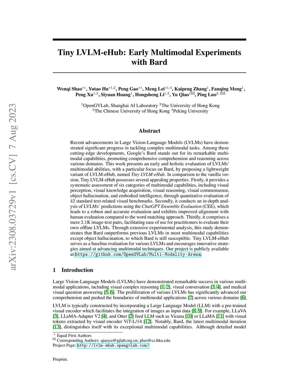 Recent advancements in Large Vision-Language Models (LVLMs) have demonstrated significant progress in tackling complex multimodal tasks. Among these cutting-edge developments, Google's Bard stands out for its remarkable multimodal capabilities, promoting comprehensive comprehension and reasoning across various domains. This work presents an early and holistic evaluation of LVLMs' multimodal abilities, with a particular focus on Bard, by proposing a lightweight variant of LVLM-eHub, named Tiny LVLM-eHub. In comparison to the vanilla version, Tiny LVLM-eHub possesses several appealing properties. Firstly, it provides a systematic assessment of six categories of multimodal capabilities, including visual perception, visual knowledge acquisition, visual reasoning, visual commonsense, object hallucination, and embodied intelligence, through quantitative evaluation of standard text-related visual benchmarks. Secondly, it conducts an in-depth analysis of LVLMs' predictions using the ChatGPT Ensemble Evaluation (CEE), which leads to a robust and accurate evaluation and exhibits improved alignment with human evaluation compared to the word matching approach. Thirdly, it comprises a mere K image-text pairs, facilitating ease of use for practitioners to evaluate their own offline LVLMs. Through extensive experimental analysis, this study demonstrates that Bard outperforms previous LVLMs in most multimodal capabilities except object hallucination, to which Bard is still susceptible. Tiny LVLM-eHub serves as a baseline evaluation for various LVLMs and encourages innovative strategies aimed at advancing multimodal techniques. Our project is publicly available at \url{https://github.com/OpenGVLab/Multi-Modality-Arena}.