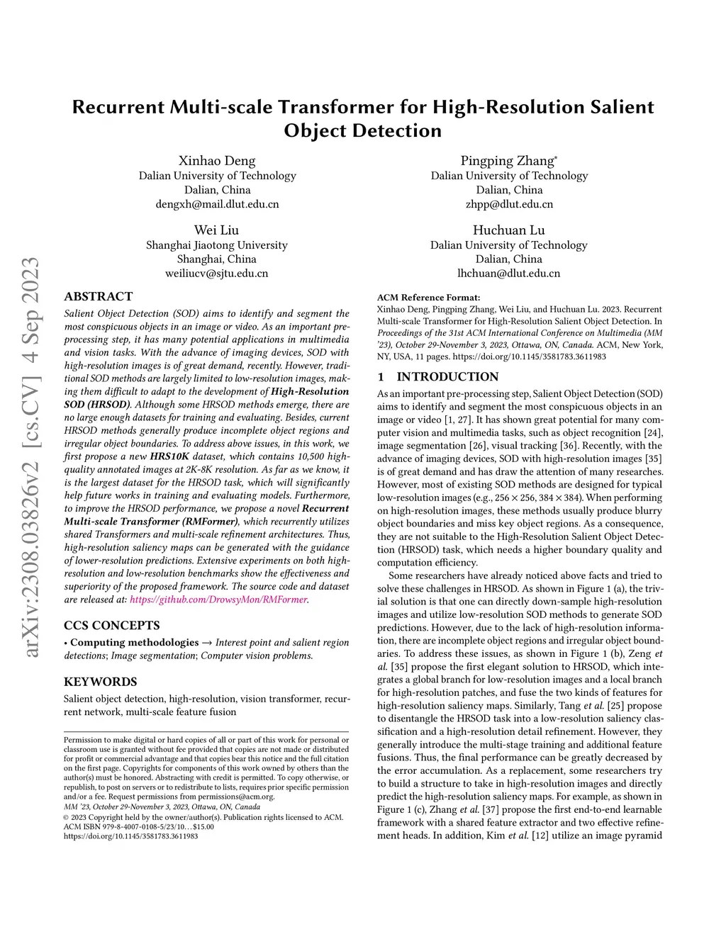 Salient Object Detection (SOD) aims to identify and segment the most conspicuous objects in an image or video. As an important pre-processing step, it has many potential applications in multimedia and vision tasks. With the advance of imaging devices, SOD with high-resolution images is of great demand, recently. However, traditional SOD methods are largely limited to low-resolution images, making them difficult to adapt to the development of High-Resolution SOD (HRSOD). Although some HRSOD methods emerge, there are no large enough datasets for training and evaluating. Besides, current HRSOD methods generally produce incomplete object regions and irregular object boundaries. To address above issues, in this work, we first propose a new HRS10K dataset, which contains 10,500 high-quality annotated images at 2K-8K resolution. As far as we know, it is the largest dataset for the HRSOD task, which will significantly help future works in training and evaluating models. Furthermore, to improve the HRSOD performance, we propose a novel Recurrent Multi-scale Transformer (RMFormer), which recurrently utilizes shared Transformers and multi-scale refinement architectures. Thus, high-resolution saliency maps can be generated with the guidance of lower-resolution predictions. Extensive experiments on both high-resolution and low-resolution benchmarks show the effectiveness and superiority of the proposed framework. The source code and dataset are released at: https://github.com/DrowsyMon/RMFormer.