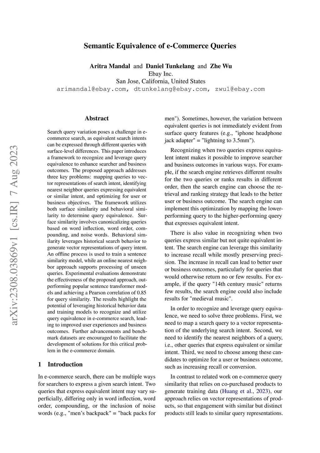 Search query variation poses a challenge in e-commerce search, as equivalent search intents can be expressed through different queries with surface-level differences. This paper introduces a framework to recognize and leverage query equivalence to enhance searcher and business outcomes. The proposed approach addresses three key problems: mapping queries to vector representations of search intent, identifying nearest neighbor queries expressing equivalent or similar intent, and optimizing for user or business objectives. The framework utilizes both surface similarity and behavioral similarity to determine query equivalence. Surface similarity involves canonicalizing queries based on word inflection, word order, compounding, and noise words. Behavioral similarity leverages historical search behavior to generate vector representations of query intent. An offline process is used to train a sentence similarity model, while an online nearest neighbor approach supports processing of unseen queries. Experimental evaluations demonstrate the effectiveness of the proposed approach, outperforming popular sentence transformer models and achieving a Pearson correlation of 0.85 for query similarity. The results highlight the potential of leveraging historical behavior data and training models to recognize and utilize query equivalence in e-commerce search, leading to improved user experiences and business outcomes. Further advancements and benchmark datasets are encouraged to facilitate the development of solutions for this critical problem in the e-commerce domain.