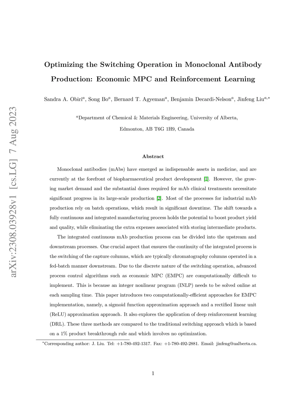 Monoclonal antibodies (mAbs) have emerged as indispensable assets in medicine, and are currently at the forefront of biopharmaceutical product development. However, the growing market demand and the substantial doses required for mAb clinical treatments necessitate significant progress in its large-scale production. Most of the processes for industrial mAb production rely on batch operations, which result in significant downtime. The shift towards a fully continuous and integrated manufacturing process holds the potential to boost product yield and quality, while eliminating the extra expenses associated with storing intermediate products. The integrated continuous mAb production process can be divided into the upstream and downstream processes. One crucial aspect that ensures the continuity of the integrated process is the switching of the capture columns, which are typically chromatography columns operated in a fed-batch manner downstream. Due to the discrete nature of the switching operation, advanced process control algorithms such as economic MPC (EMPC) are computationally difficult to implement. This is because an integer nonlinear program (INLP) needs to be solved online at each sampling time. This paper introduces two computationally-efficient approaches for EMPC implementation, namely, a sigmoid function approximation approach and a rectified linear unit (ReLU) approximation approach. It also explores the application of deep reinforcement learning (DRL). These three methods are compared to the traditional switching approach which is based on a 1% product breakthrough rule and which involves no optimization.