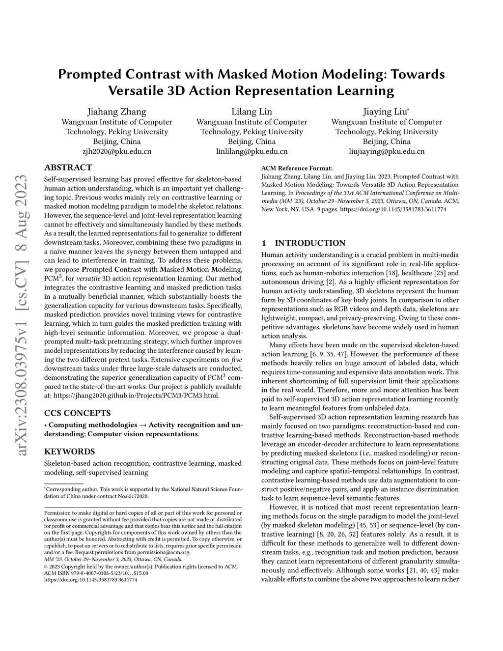 Self-supervised learning has proved effective for skeleton-based human action understanding, which is an important yet challenging topic. Previous works mainly rely on contrastive learning or masked motion modeling paradigm to model the skeleton relations. However, the sequence-level and joint-level representation learning cannot be effectively and simultaneously handled by these methods. As a result, the learned representations fail to generalize to different downstream tasks. Moreover, combining these two paradigms in a naive manner leaves the synergy between them untapped and can lead to interference in training. To address these problems, we propose Prompted Contrast with Masked Motion Modeling, PCM, for versatile 3D action representation learning. Our method integrates the contrastive learning and masked prediction tasks in a mutually beneficial manner, which substantially boosts the generalization capacity for various downstream tasks. Specifically, masked prediction provides novel training views for contrastive learning, which in turn guides the masked prediction training with high-level semantic information. Moreover, we propose a dual-prompted multi-task pretraining strategy, which further improves model representations by reducing the interference caused by learning the two different pretext tasks. Extensive experiments on five downstream tasks under three large-scale datasets are conducted, demonstrating the superior generalization capacity of PCM compared to the state-of-the-art works. Our project is publicly available at: https://jhang2020.github.io/Projects/PCM3/PCM3.html .