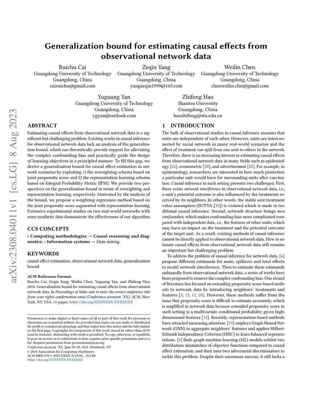 Estimating causal effects from observational network data is a significant but challenging problem. Existing works in causal inference for observational network data lack an analysis of the generalization bound, which can theoretically provide support for alleviating the complex confounding bias and practically guide the design of learning objectives in a principled manner. To fill this gap, we derive a generalization bound for causal effect estimation in network scenarios by exploiting 1) the reweighting schema based on joint propensity score and 2) the representation learning schema based on Integral Probability Metric (IPM). We provide two perspectives on the generalization bound in terms of reweighting and representation learning, respectively. Motivated by the analysis of the bound, we propose a weighting regression method based on the joint propensity score augmented with representation learning. Extensive experimental studies on two real-world networks with semi-synthetic data demonstrate the effectiveness of our algorithm.