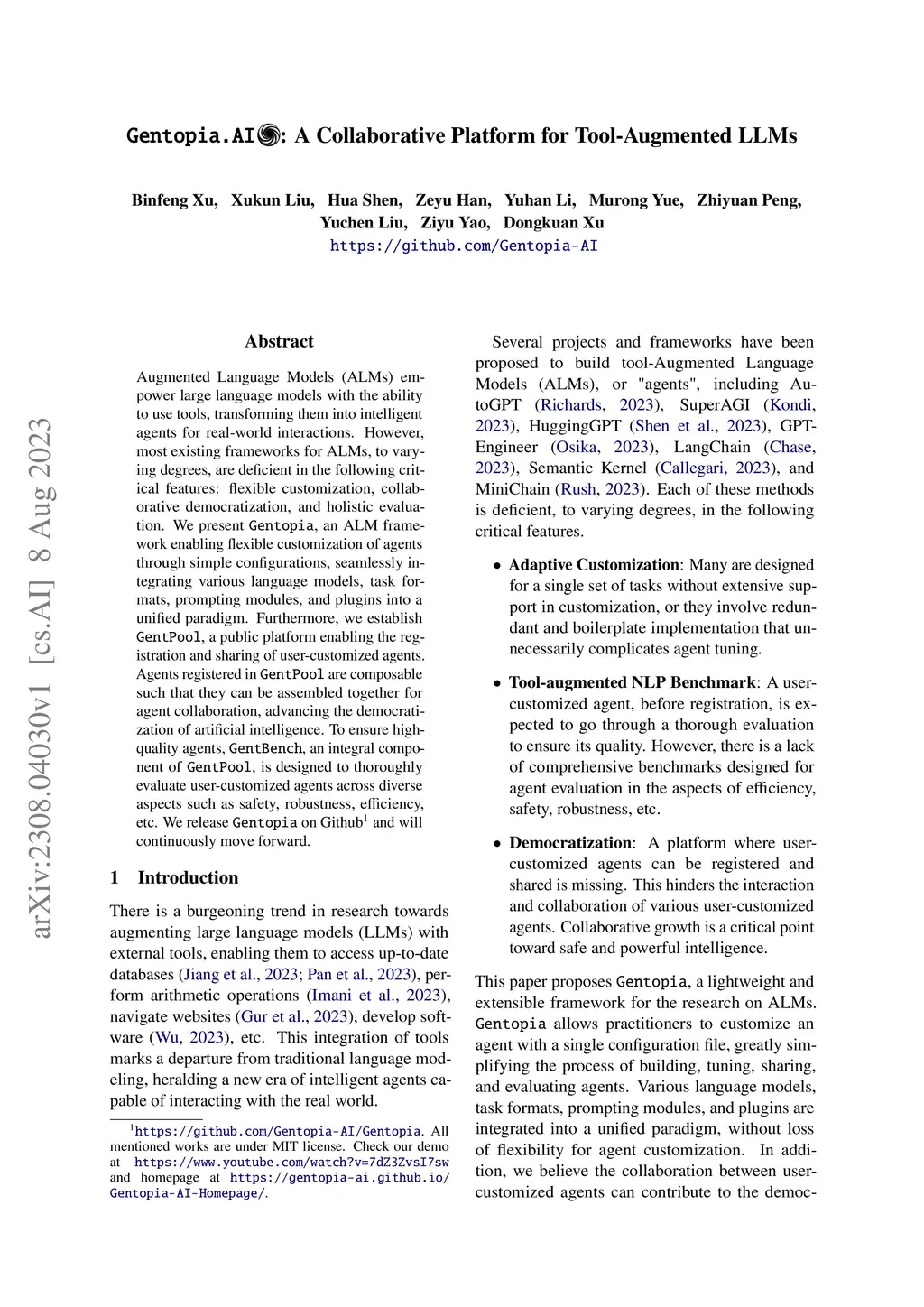 Augmented Language Models (ALMs) empower large language models with the ability to use tools, transforming them into intelligent agents for real-world interactions. However, most existing frameworks for ALMs, to varying degrees, are deficient in the following critical features: flexible customization, collaborative democratization, and holistic evaluation. We present gentopia, an ALM framework enabling flexible customization of agents through simple configurations, seamlessly integrating various language models, task formats, prompting modules, and plugins into a unified paradigm. Furthermore, we establish gentpool, a public platform enabling the registration and sharing of user-customized agents. Agents registered in gentpool are composable such that they can be assembled together for agent collaboration, advancing the democratization of artificial intelligence. To ensure high-quality agents, gentbench, an integral component of gentpool, is designed to thoroughly evaluate user-customized agents across diverse aspects such as safety, robustness, efficiency, etc. We release gentopia on Github and will continuously move forward.