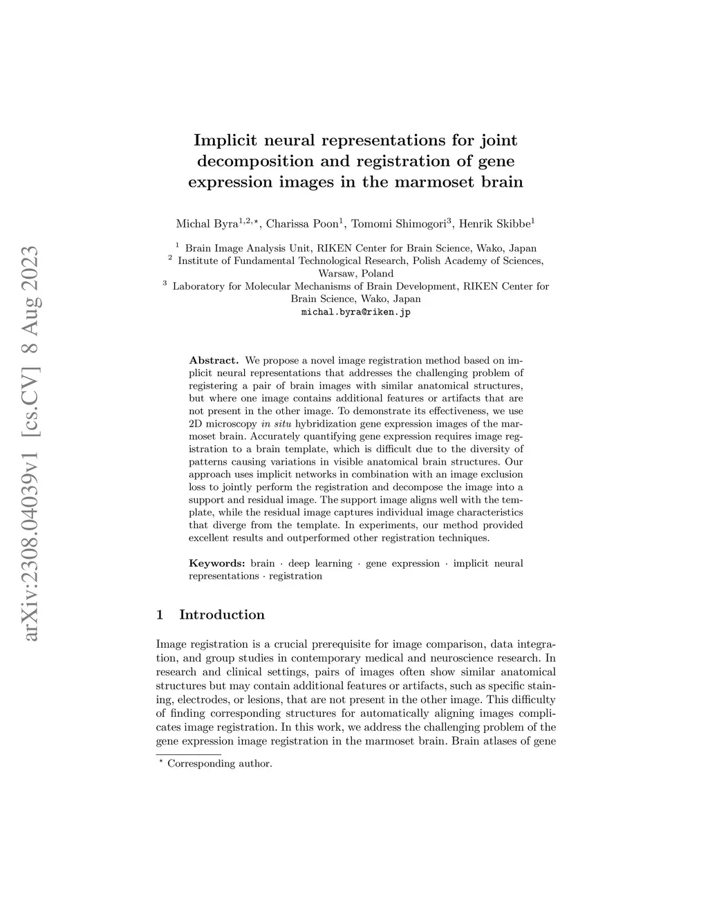 We propose a novel image registration method based on implicit neural representations that addresses the challenging problem of registering a pair of brain images with similar anatomical structures, but where one image contains additional features or artifacts that are not present in the other image. To demonstrate its effectiveness, we use 2D microscopy hybridization gene expression images of the marmoset brain. Accurately quantifying gene expression requires image registration to a brain template, which is difficult due to the diversity of patterns causing variations in visible anatomical brain structures. Our approach uses implicit networks in combination with an image exclusion loss to jointly perform the registration and decompose the image into a support and residual image. The support image aligns well with the template, while the residual image captures individual image characteristics that diverge from the template. In experiments, our method provided excellent results and outperformed other registration techniques.