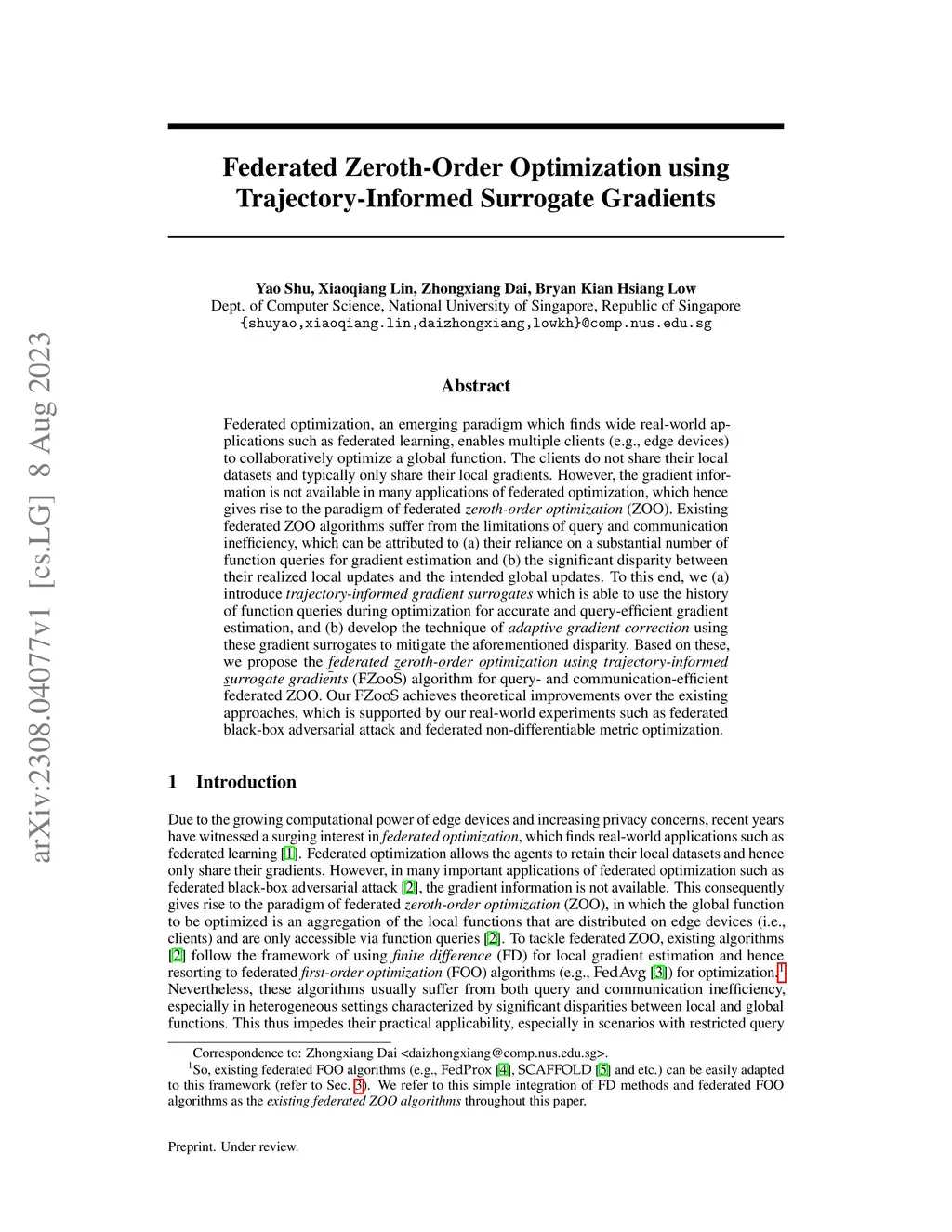 Federated optimization, an emerging paradigm which finds wide real-world applications such as federated learning, enables multiple clients (e.g., edge devices) to collaboratively optimize a global function. The clients do not share their local datasets and typically only share their local gradients. However, the gradient information is not available in many applications of federated optimization, which hence gives rise to the paradigm of federated zeroth-order optimization (ZOO). Existing federated ZOO algorithms suffer from the limitations of query and communication inefficiency, which can be attributed to (a) their reliance on a substantial number of function queries for gradient estimation and (b) the significant disparity between their realized local updates and the intended global updates. To this end, we (a) introduce trajectory-informed gradient surrogates which is able to use the history of function queries during optimization for accurate and query-efficient gradient estimation, and (b) develop the technique of adaptive gradient correction using these gradient surrogates to mitigate the aforementioned disparity. Based on these, we propose the federated zeroth-order optimization using trajectory-informed surrogate gradients (FZooS) algorithm for query- and communication-efficient federated ZOO. Our FZooS achieves theoretical improvements over the existing approaches, which is supported by our real-world experiments such as federated black-box adversarial attack and federated non-differentiable metric optimization.