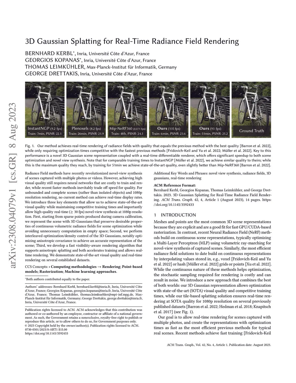 Radiance Field methods have recently revolutionized novel-view synthesis of scenes captured with multiple photos or videos. However, achieving high visual quality still requires neural networks that are costly to train and render, while recent faster methods inevitably trade off speed for quality. For unbounded and complete scenes (rather than isolated objects) and 1080p resolution rendering, no current method can achieve real-time display rates. We introduce three key elements that allow us to achieve state-of-the-art visual quality while maintaining competitive training times and importantly allow high-quality real-time (>= 30 fps) novel-view synthesis at 1080p resolution. First, starting from sparse points produced during camera calibration, we represent the scene with 3D Gaussians that preserve desirable properties of continuous volumetric radiance fields for scene optimization while avoiding unnecessary computation in empty space; Second, we perform interleaved optimization/density control of the 3D Gaussians, notably optimizing anisotropic covariance to achieve an accurate representation of the scene; Third, we develop a fast visibility-aware rendering algorithm that supports anisotropic splatting and both accelerates training and allows realtime rendering. We demonstrate state-of-the-art visual quality and real-time rendering on several established datasets.