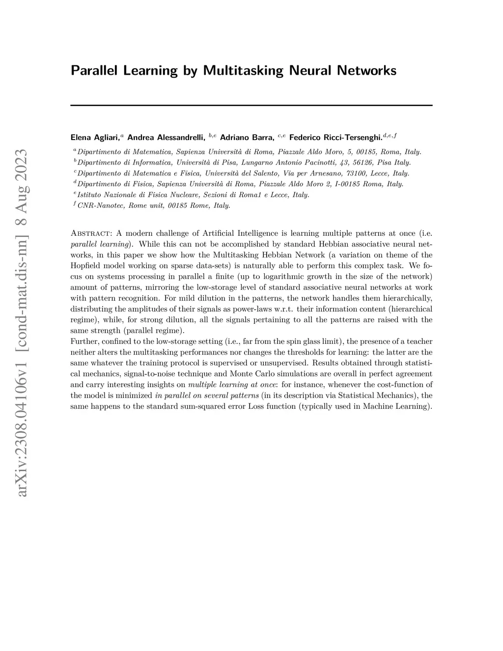 A modern challenge of Artificial Intelligence is learning multiple patterns at once (i.e.parallel learning). While this can not be accomplished by standard Hebbian associative neural networks, in this paper we show how the Multitasking Hebbian Network (a variation on theme of the Hopfield model working on sparse data-sets) is naturally able to perform this complex task. We focus on systems processing in parallel a finite (up to logarithmic growth in the size of the network) amount of patterns, mirroring the low-storage level of standard associative neural networks at work with pattern recognition. For mild dilution in the patterns, the network handles them hierarchically, distributing the amplitudes of their signals as power-laws w.r.t. their information content (hierarchical regime), while, for strong dilution, all the signals pertaining to all the patterns are raised with the same strength (parallel regime). Further, confined to the low-storage setting (i.e., far from the spin glass limit), the presence of a teacher neither alters the multitasking performances nor changes the thresholds for learning: the latter are the same whatever the training protocol is supervised or unsupervised. Results obtained through statistical mechanics, signal-to-noise technique and Monte Carlo simulations are overall in perfect agreement and carry interesting insights on multiple learning at once: for instance, whenever the cost-function of the model is minimized in parallel on several patterns (in its description via Statistical Mechanics), the same happens to the standard sum-squared error Loss function (typically used in Machine Learning).