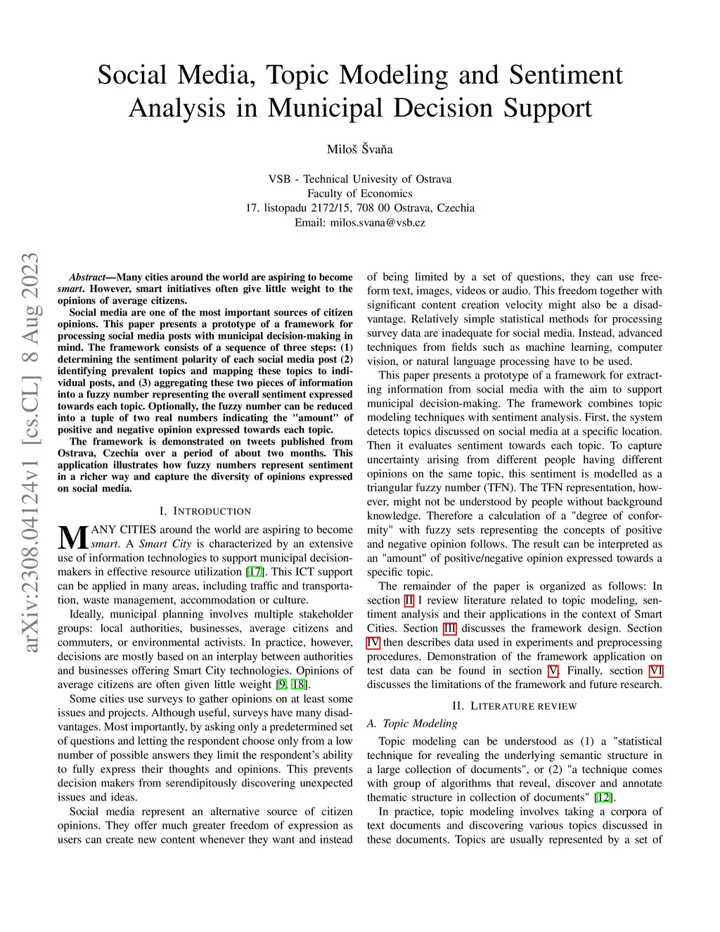 Many cities around the world are aspiring to become. However, smart initiatives often give little weight to the opinions of average citizens. Social media are one of the most important sources of citizen opinions. This paper presents a prototype of a framework for processing social media posts with municipal decision-making in mind. The framework consists of a sequence of three steps: (1) determining the sentiment polarity of each social media post (2) identifying prevalent topics and mapping these topics to individual posts, and (3) aggregating these two pieces of information into a fuzzy number representing the overall sentiment expressed towards each topic. Optionally, the fuzzy number can be reduced into a tuple of two real numbers indicating the "amount" of positive and negative opinion expressed towards each topic. The framework is demonstrated on tweets published from Ostrava, Czechia over a period of about two months. This application illustrates how fuzzy numbers represent sentiment in a richer way and capture the diversity of opinions expressed on social media.
