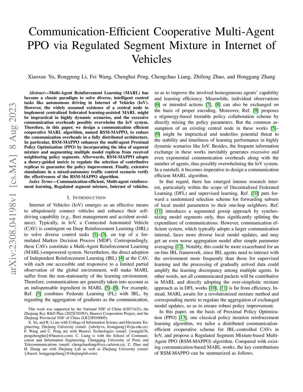 Multi-Agent Reinforcement Learning (MARL) has become a classic paradigm to solve diverse, intelligent control tasks like autonomous driving in Internet of Vehicles (IoV). However, the widely assumed existence of a central node to implement centralized federated learning-assisted MARL might be impractical in highly dynamic scenarios, and the excessive communication overheads possibly overwhelm the IoV system. Therefore, in this paper, we design a communication efficient cooperative MARL algorithm, named RSM-MAPPO, to reduce the communication overheads in a fully distributed architecture. In particular, RSM-MAPPO enhances the multi-agent Proximal Policy Optimization (PPO) by incorporating the idea of segment mixture and augmenting multiple model replicas from received neighboring policy segments. Afterwards, RSM-MAPPO adopts a theory-guided metric to regulate the selection of contributive replicas to guarantee the policy improvement. Finally, extensive simulations in a mixed-autonomy traffic control scenario verify the effectiveness of the RSM-MAPPO algorithm.