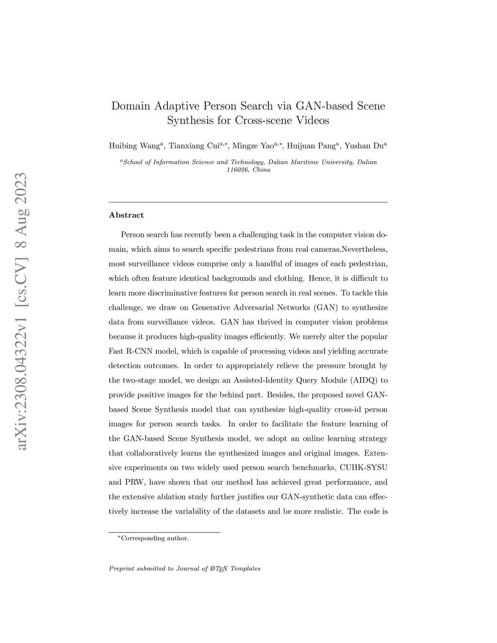 Person search has recently been a challenging task in the computer vision domain, which aims to search specific pedestrians from real cameras.Nevertheless, most surveillance videos comprise only a handful of images of each pedestrian, which often feature identical backgrounds and clothing. Hence, it is difficult to learn more discriminative features for person search in real scenes. To tackle this challenge, we draw on Generative Adversarial Networks (GAN) to synthesize data from surveillance videos. GAN has thrived in computer vision problems because it produces high-quality images efficiently. We merely alter the popular Fast R-CNN model, which is capable of processing videos and yielding accurate detection outcomes. In order to appropriately relieve the pressure brought by the two-stage model, we design an Assisted-Identity Query Module (AIDQ) to provide positive images for the behind part. Besides, the proposed novel GAN-based Scene Synthesis model that can synthesize high-quality cross-id person images for person search tasks. In order to facilitate the feature learning of the GAN-based Scene Synthesis model, we adopt an online learning strategy that collaboratively learns the synthesized images and original images. Extensive experiments on two widely used person search benchmarks, CUHK-SYSU and PRW, have shown that our method has achieved great performance, and the extensive ablation study further justifies our GAN-synthetic data can effectively increase the variability of the datasets and be more realistic.