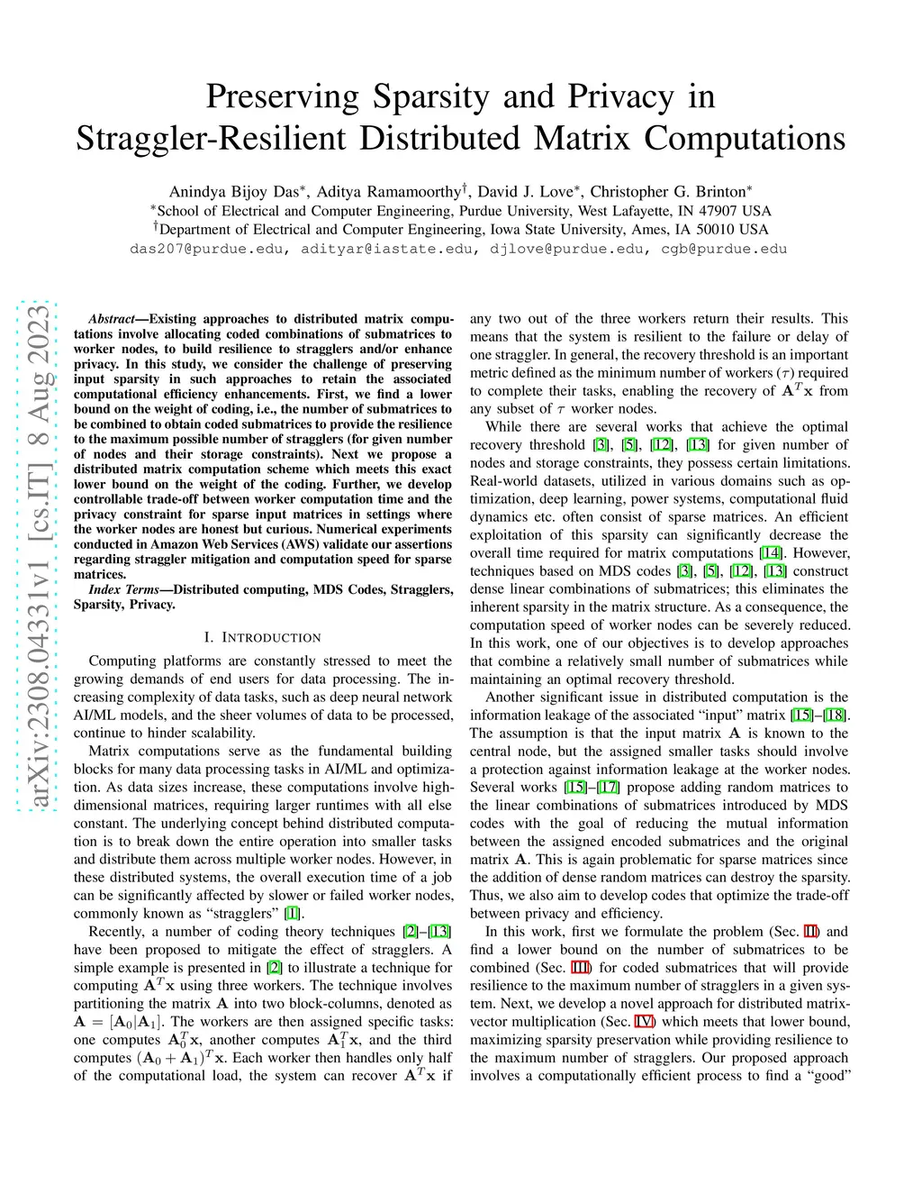 Existing approaches to distributed matrix computations involve allocating coded combinations of submatrices to worker nodes, to build resilience to stragglers and/or enhance privacy. In this study, we consider the challenge of preserving input sparsity in such approaches to retain the associated computational efficiency enhancements. First, we find a lower bound on the weight of coding, i.e., the number of submatrices to be combined to obtain coded submatrices to provide the resilience to the maximum possible number of stragglers (for given number of nodes and their storage constraints). Next we propose a distributed matrix computation scheme which meets this exact lower bound on the weight of the coding. Further, we develop controllable trade-off between worker computation time and the privacy constraint for sparse input matrices in settings where the worker nodes are honest but curious. Numerical experiments conducted in Amazon Web Services (AWS) validate our assertions regarding straggler mitigation and computation speed for sparse matrices.