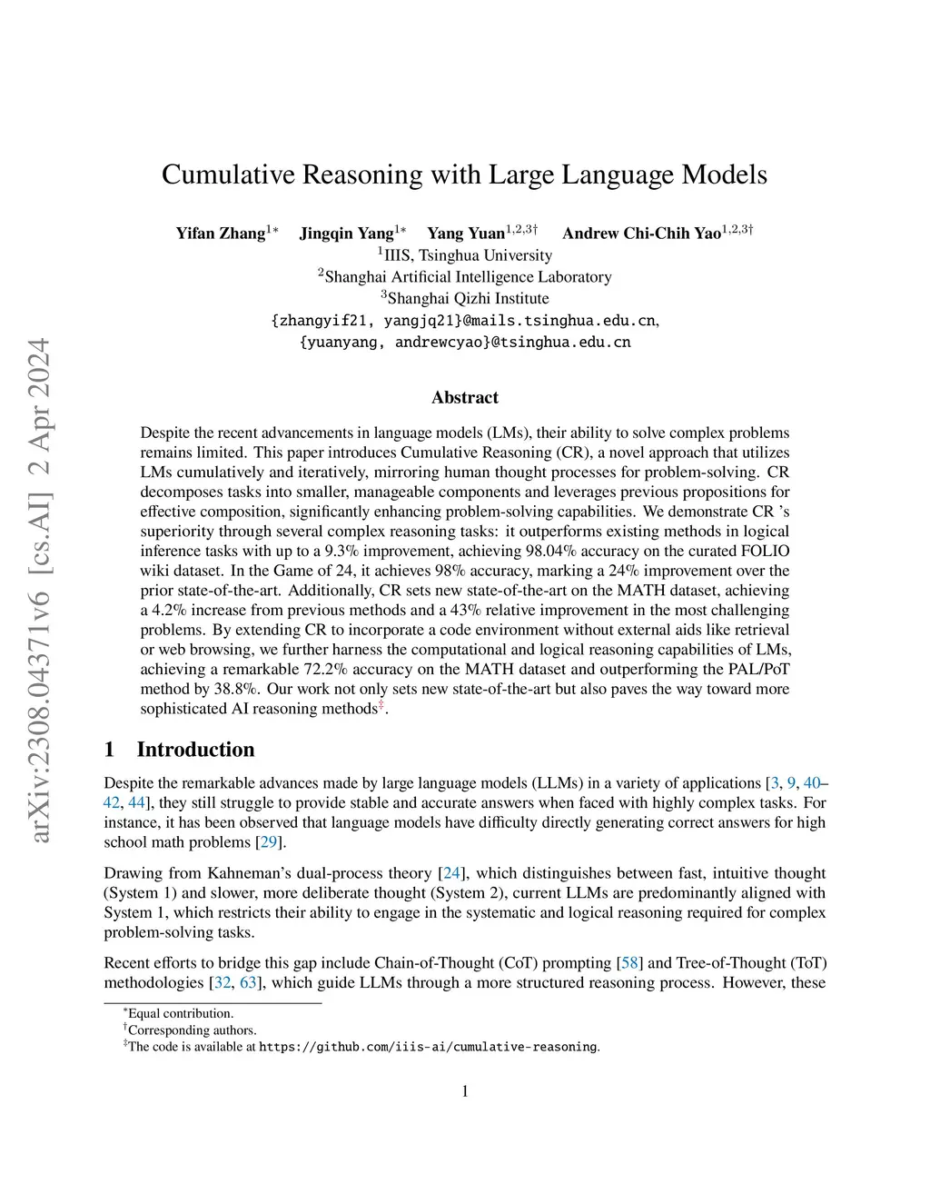 Cumulative Reasoning with Large Language Models