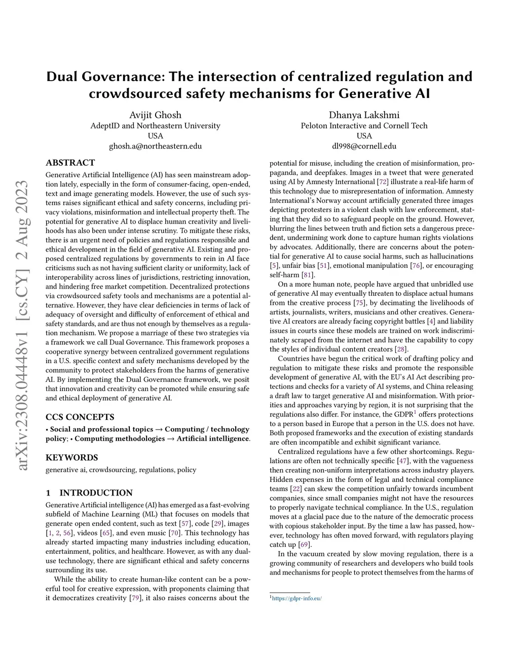 Generative Artificial Intelligence (AI) has seen mainstream adoption lately, especially in the form of consumer-facing, open-ended, text and image generating models. However, the use of such systems raises significant ethical and safety concerns, including privacy violations, misinformation and intellectual property theft. The potential for generative AI to displace human creativity and livelihoods has also been under intense scrutiny. To mitigate these risks, there is an urgent need of policies and regulations responsible and ethical development in the field of generative AI. Existing and proposed centralized regulations by governments to rein in AI face criticisms such as not having sufficient clarity or uniformity, lack of interoperability across lines of jurisdictions, restricting innovation, and hindering free market competition. Decentralized protections via crowdsourced safety tools and mechanisms are a potential alternative. However, they have clear deficiencies in terms of lack of adequacy of oversight and difficulty of enforcement of ethical and safety standards, and are thus not enough by themselves as a regulation mechanism. We propose a marriage of these two strategies via a framework we call Dual Governance. This framework proposes a cooperative synergy between centralized government regulations in a U.S. specific context and safety mechanisms developed by the community to protect stakeholders from the harms of generative AI. By implementing the Dual Governance framework, we posit that innovation and creativity can be promoted while ensuring safe and ethical deployment of generative AI.