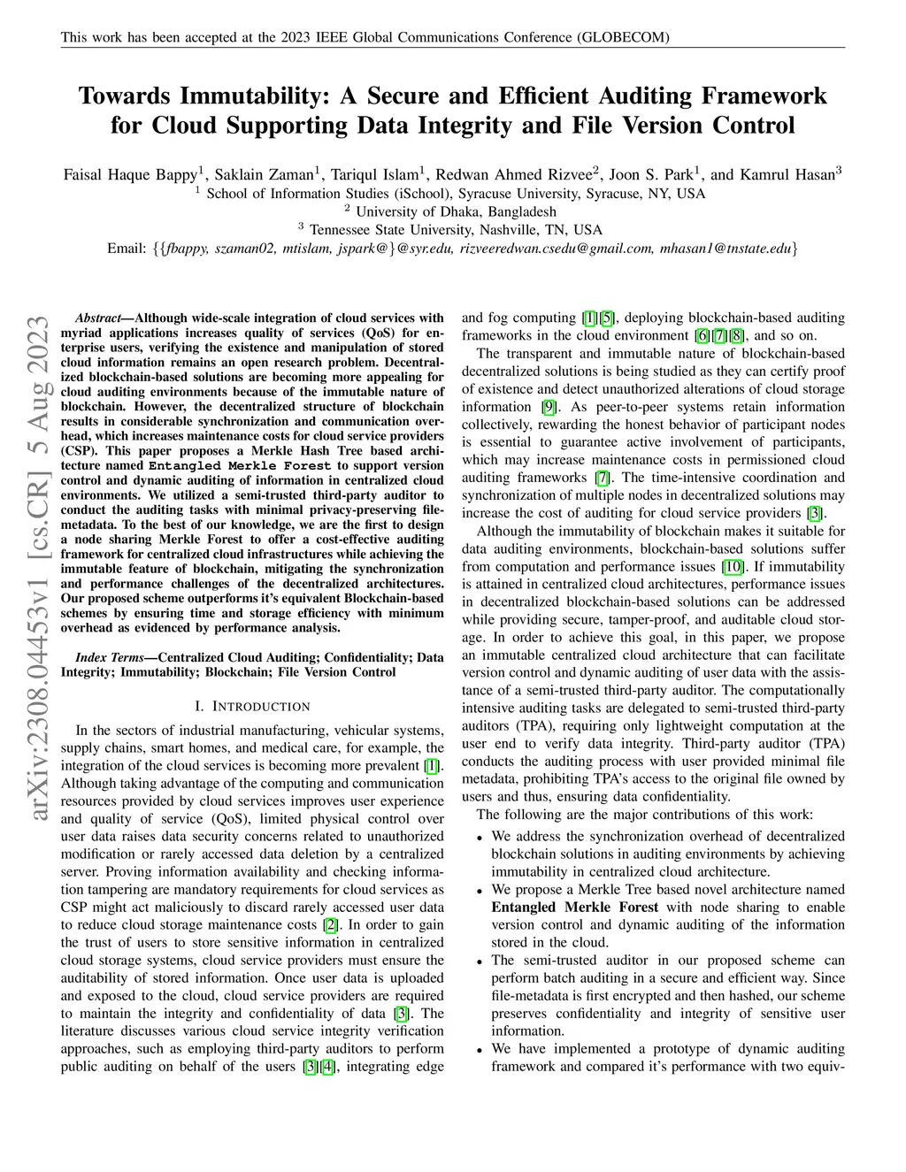 Although wide-scale integration of cloud services with myriad applications increases quality of services (QoS) for enterprise users, verifying the existence and manipulation of stored cloud information remains an open research problem. Decentralized blockchain-based solutions are becoming more appealing for cloud auditing environments because of the immutable nature of blockchain. However, the decentralized structure of blockchain results in considerable synchronization and communication overhead, which increases maintenance costs for cloud service providers (CSP). This paper proposes a Merkle Hash Tree based architecture named Entangled Merkle Forest to support version control and dynamic auditing of information in centralized cloud environments. We utilized a semi-trusted third-party auditor to conduct the auditing tasks with minimal privacy-preserving file metadata. To the best of our knowledge, we are the first to design a node sharing Merkle Forest to offer a cost-effective auditing framework for centralized cloud infrastructures while achieving the immutable feature of blockchain, mitigating the synchronization and performance challenges of the decentralized architectures. Our proposed scheme outperforms it's equivalent Blockchain-based schemes by ensuring time and storage efficiency with minimum overhead as evidenced by performance analysis.