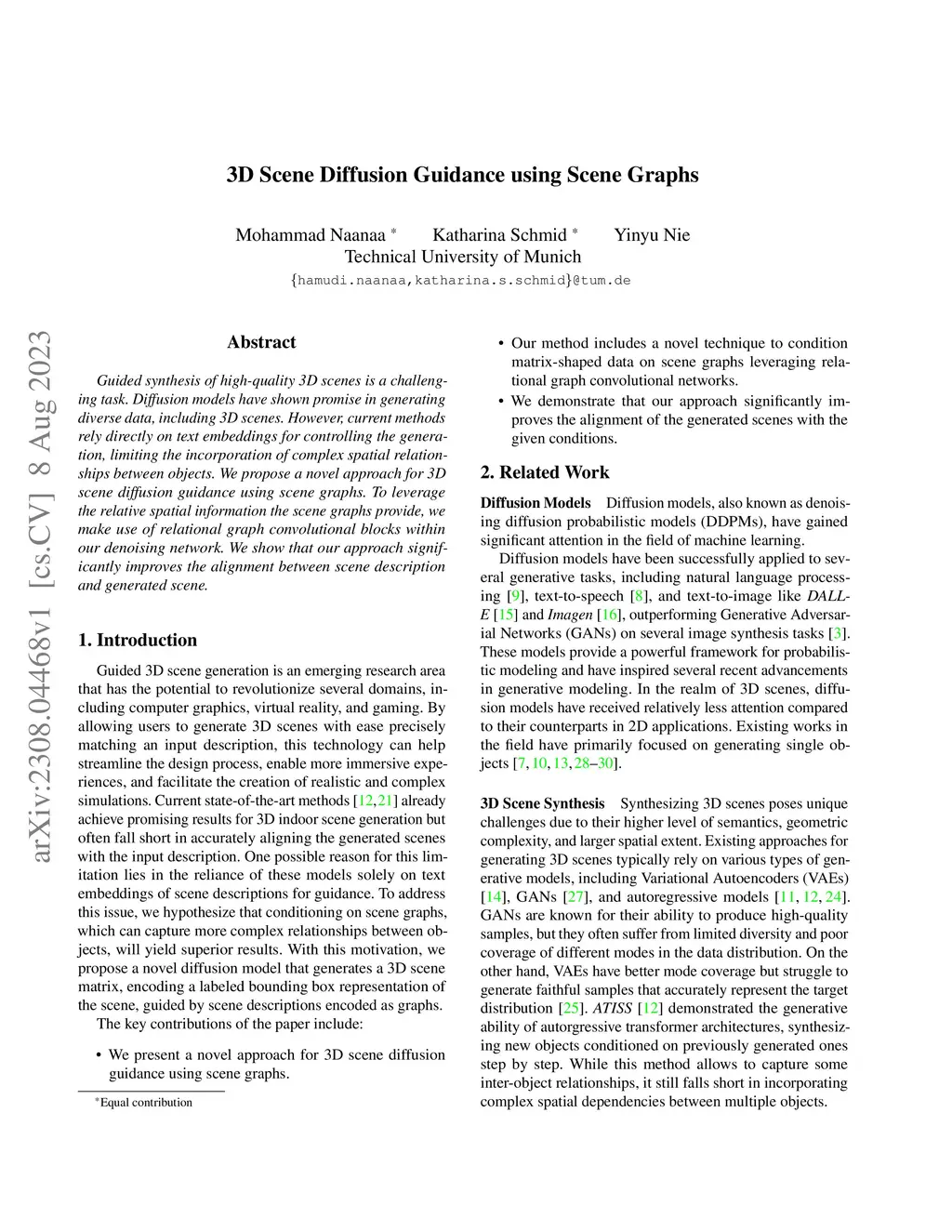 Guided synthesis of high-quality 3D scenes is a challenging task. Diffusion models have shown promise in generating diverse data, including 3D scenes. However, current methods rely directly on text embeddings for controlling the generation, limiting the incorporation of complex spatial relationships between objects. We propose a novel approach for 3D scene diffusion guidance using scene graphs. To leverage the relative spatial information the scene graphs provide, we make use of relational graph convolutional blocks within our denoising network. We show that our approach significantly improves the alignment between scene description and generated scene.