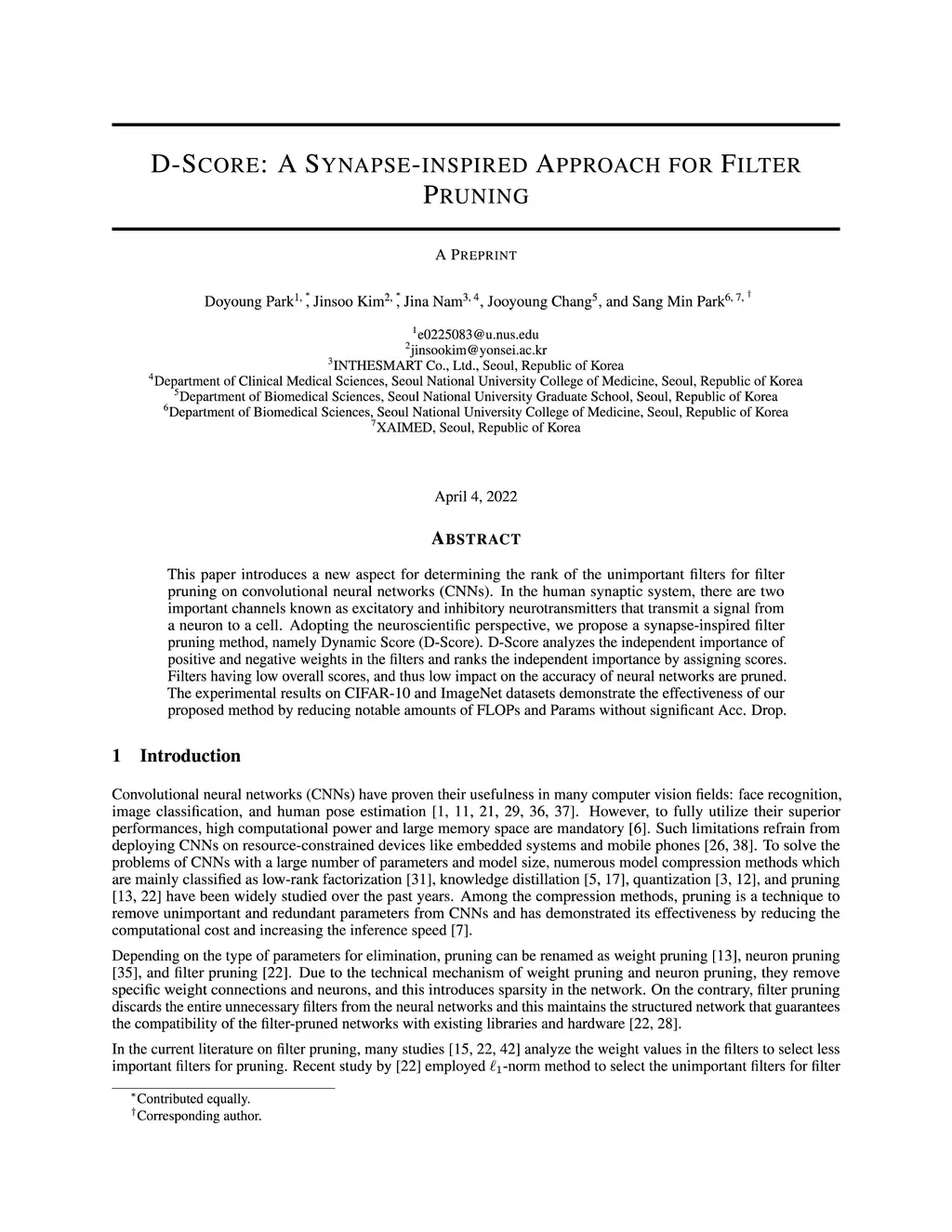 D-Score: A Synapse-Inspired Approach for Filter Pruning
