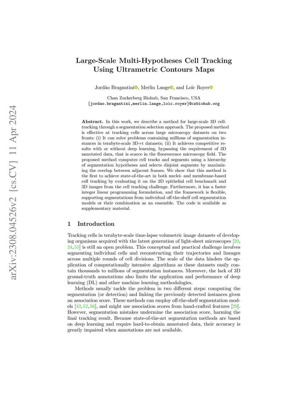 Large-Scale Multi-Hypotheses Cell Tracking Using Ultrametric Contours