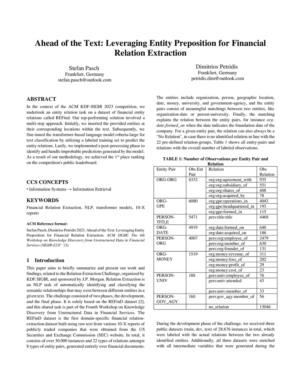 In the context of the ACM KDF-SIGIR 2023 competition, we undertook an entity relation task on a dataset of financial entity relations called REFind. Our top-performing solution involved a multi-step approach. Initially, we inserted the provided entities at their corresponding locations within the text. Subsequently, we fine-tuned the transformer-based language model roberta-large for text classification by utilizing a labeled training set to predict the entity relations. Lastly, we implemented a post-processing phase to identify and handle improbable predictions generated by the model. As a result of our methodology, we achieved the 1st place ranking on the competition's public leaderboard.