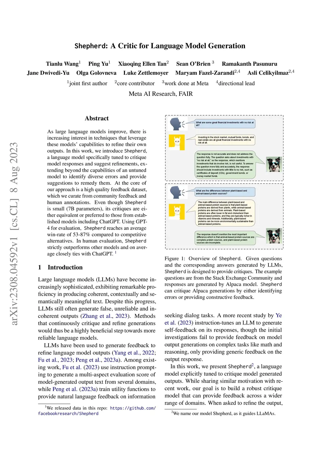 As large language models improve, there is increasing interest in techniques that leverage these models' capabilities to refine their own outputs. In this work, we introduce Shepherd, a language model specifically tuned to critique responses and suggest refinements, extending beyond the capabilities of an untuned model to identify diverse errors and provide suggestions to remedy them. At the core of our approach is a high quality feedback dataset, which we curate from community feedback and human annotations. Even though Shepherd is small (7B parameters), its critiques are either equivalent or preferred to those from established models including ChatGPT. Using GPT-4 for evaluation, Shepherd reaches an average win-rate of 53-87% compared to competitive alternatives. In human evaluation, Shepherd strictly outperforms other models and on average closely ties with ChatGPT.