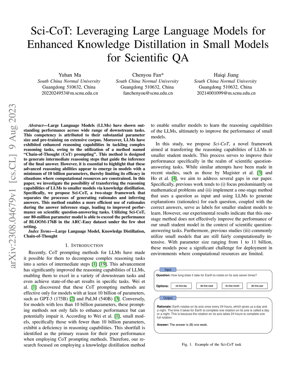 Large Language Models (LLMs) have shown outstanding performance across wide range of downstream tasks. This competency is attributed to their substantial parameter size and pre-training on extensive corpus. Moreover, LLMs have exhibited enhanced reasoning capabilities in tackling complex reasoning tasks, owing to the utilization of a method named ``Chain-of-Thought (CoT) prompting''. This method is designed to generate intermediate reasoning steps that guide the inference of the final answer. However, it is essential to highlight that these advanced reasoning abilities appear to emerge in models with a minimum of 10 billion parameters, thereby limiting its efficacy in situations where computational resources are constrained. In this paper, we investigate the possibility of transferring the reasoning capabilities of LLMs to smaller models via knowledge distillation. Specifically, we propose Sci-CoT, a two-stage framework that separates the processes of generating rationales and inferring answers. This method enables a more efficient use of rationales during the answer inference stage, leading to improved performance on scientific question-answering tasks. Utilizing Sci-CoT, our 80-million parameter model is able to exceed the performance of BLOOM-176B in the ARC-Easy dataset under the few shot setting.