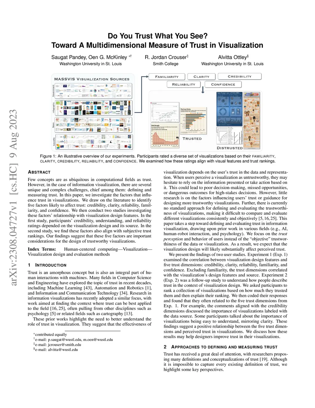 Few concepts are as ubiquitous in computational fields as trust. However, in the case of information visualization, there are several unique and complex challenges, chief among them: defining and measuring trust. In this paper, we investigate the factors that influence trust in visualizations. We draw on the literature to identify five factors likely to affect trust: credibility, clarity, reliability, familiarity, and confidence. We then conduct two studies investigating these factors' relationship with visualization design features. In the first study, participants' credibility, understanding, and reliability ratings depended on the visualization design and its source. In the second study, we find these factors also align with subjective trust rankings. Our findings suggest that these five factors are important considerations for the design of trustworthy visualizations.
